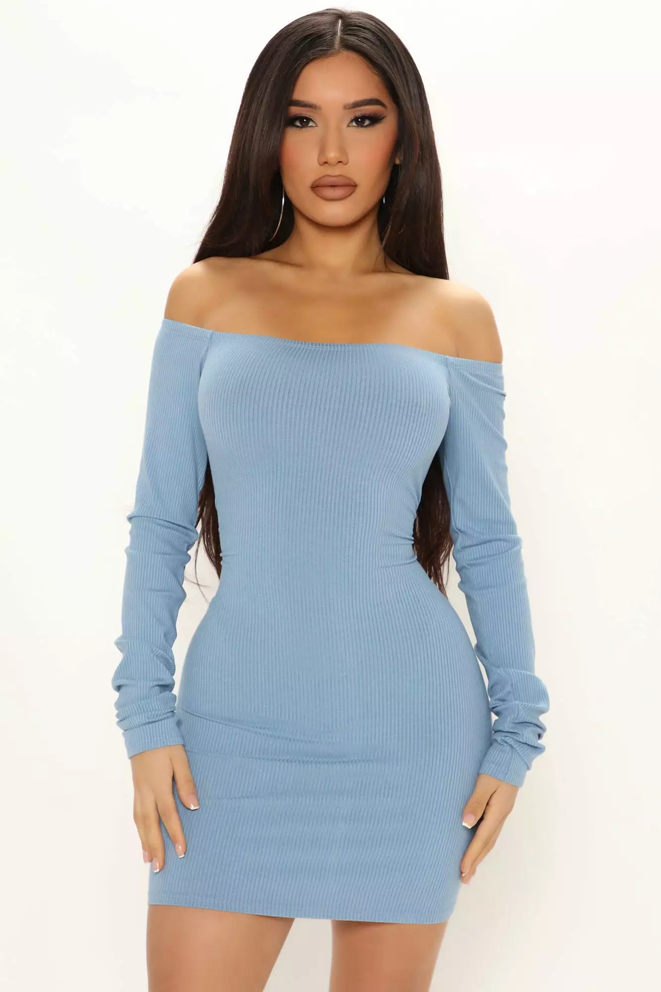 Fashion Nova Alpha Off Shoulder Snatched Mini Dress – Light Blue