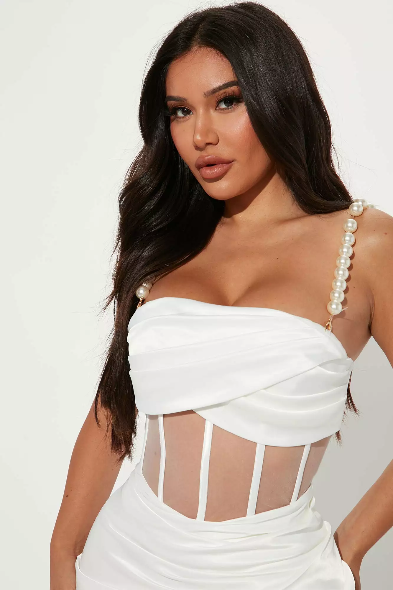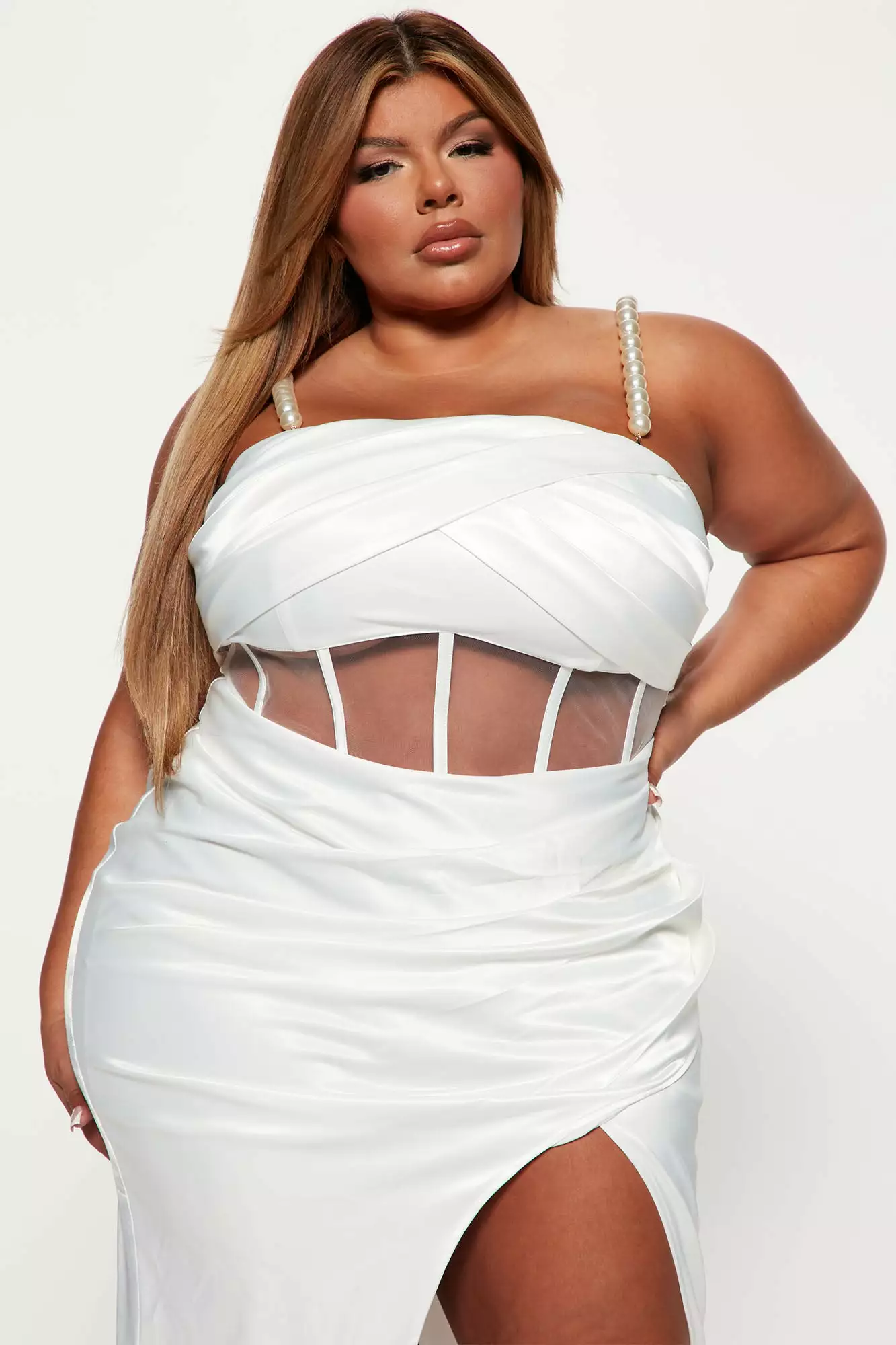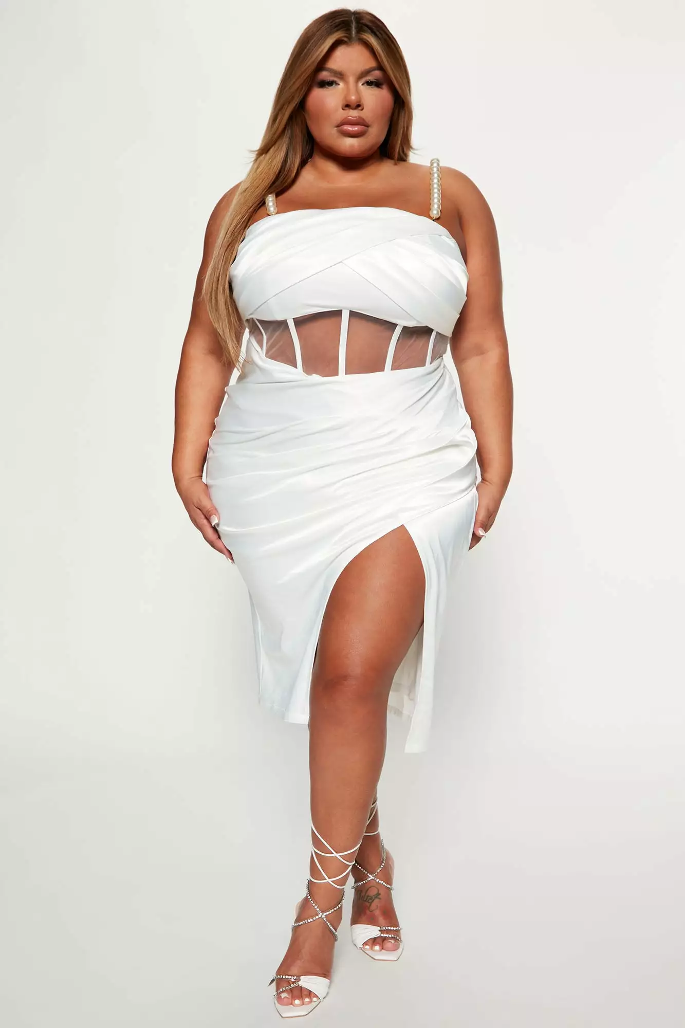 Fashion Nova Champagne Shower Satin Midi Dress – White