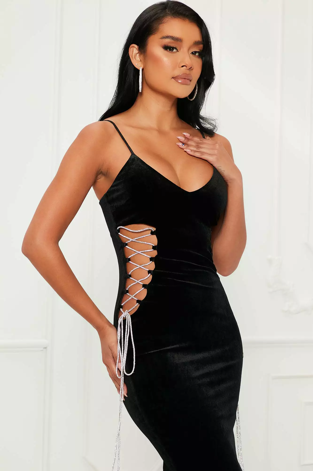 SKU: 6537375383676 Category: Maxi Dresses Tags: All Promo, atticket, color:Black, ColorFam-Black, detail:High Slit, Dresses, fabric:Velvet, fallbogo, LBD