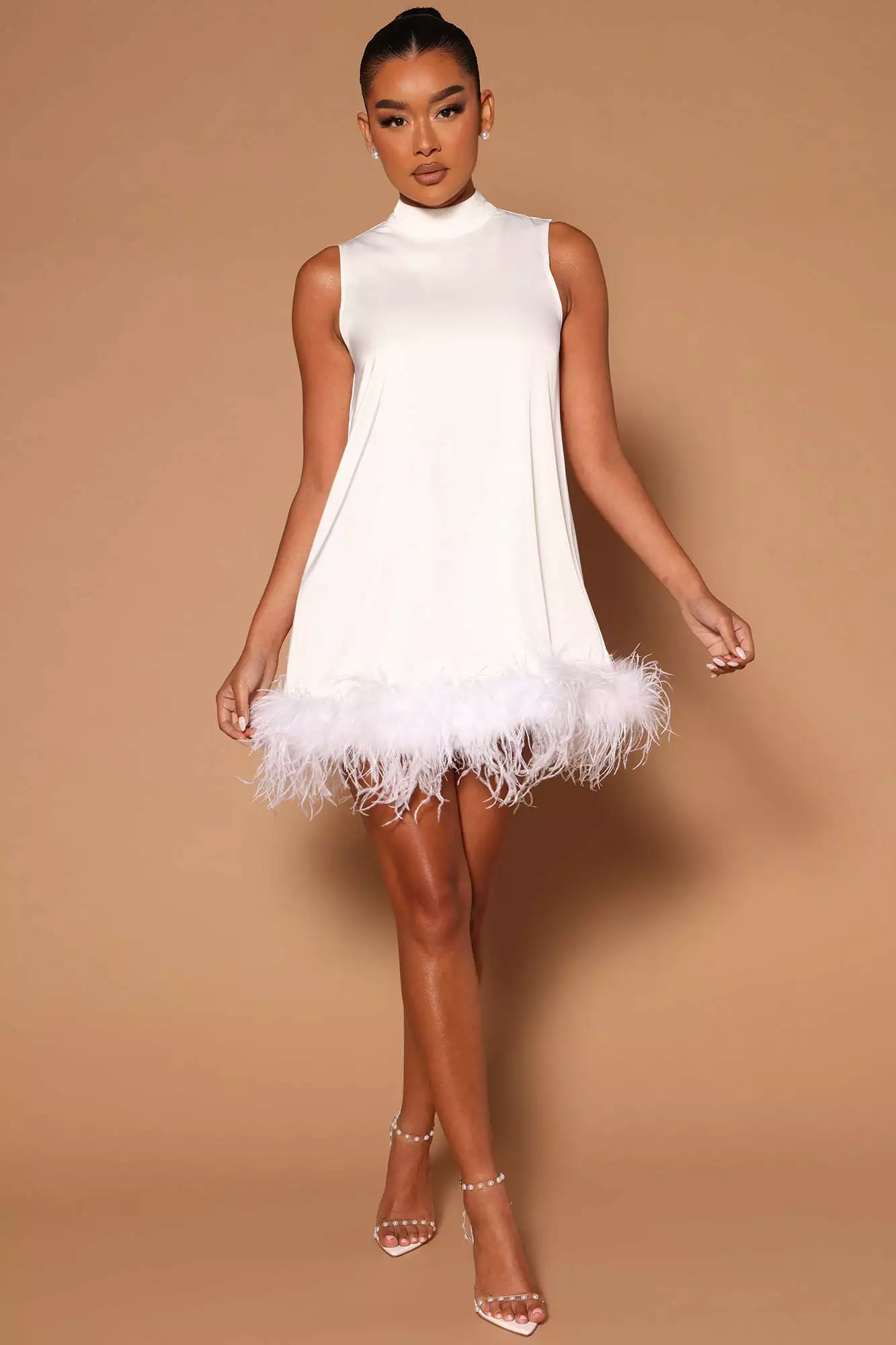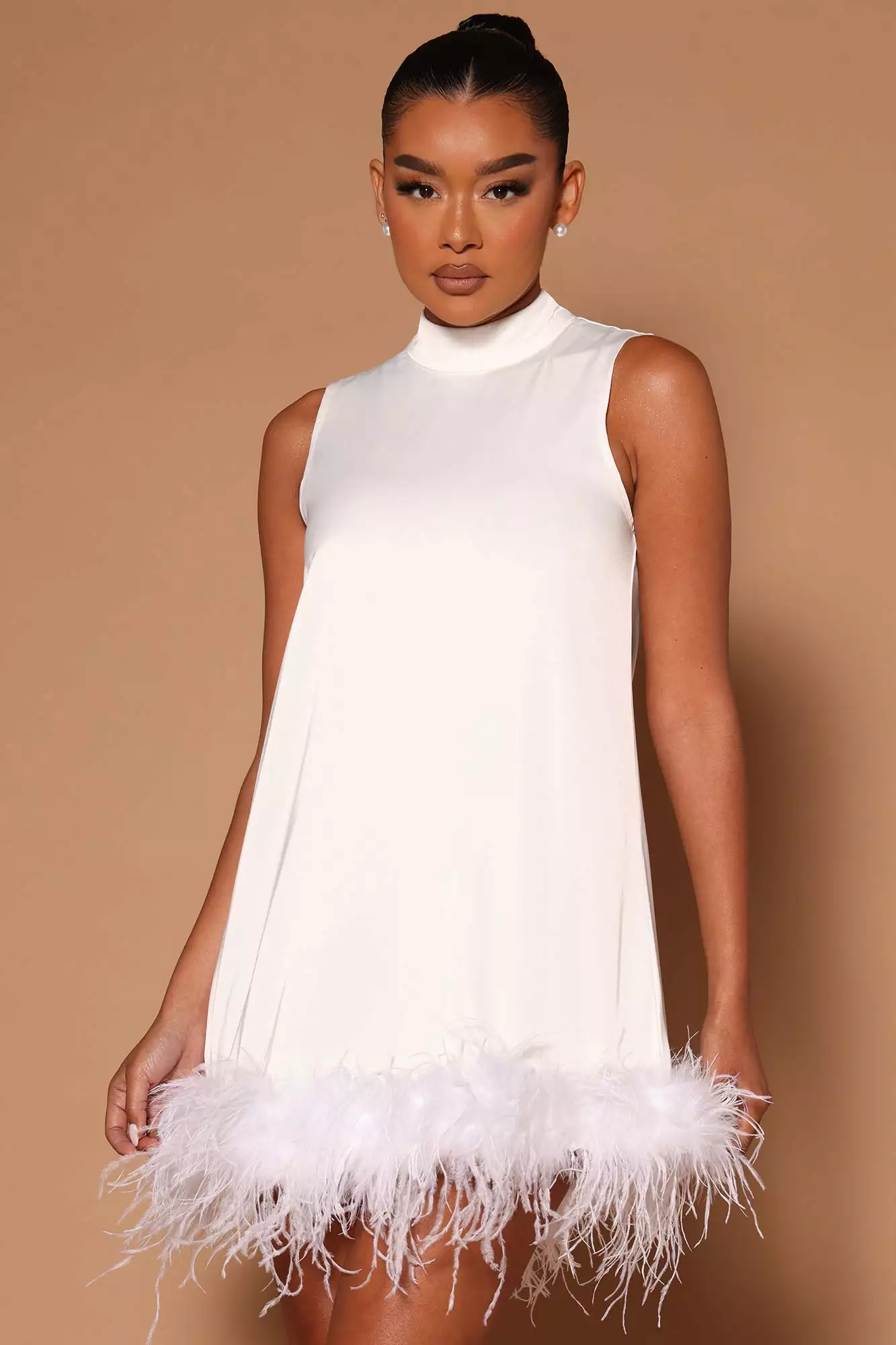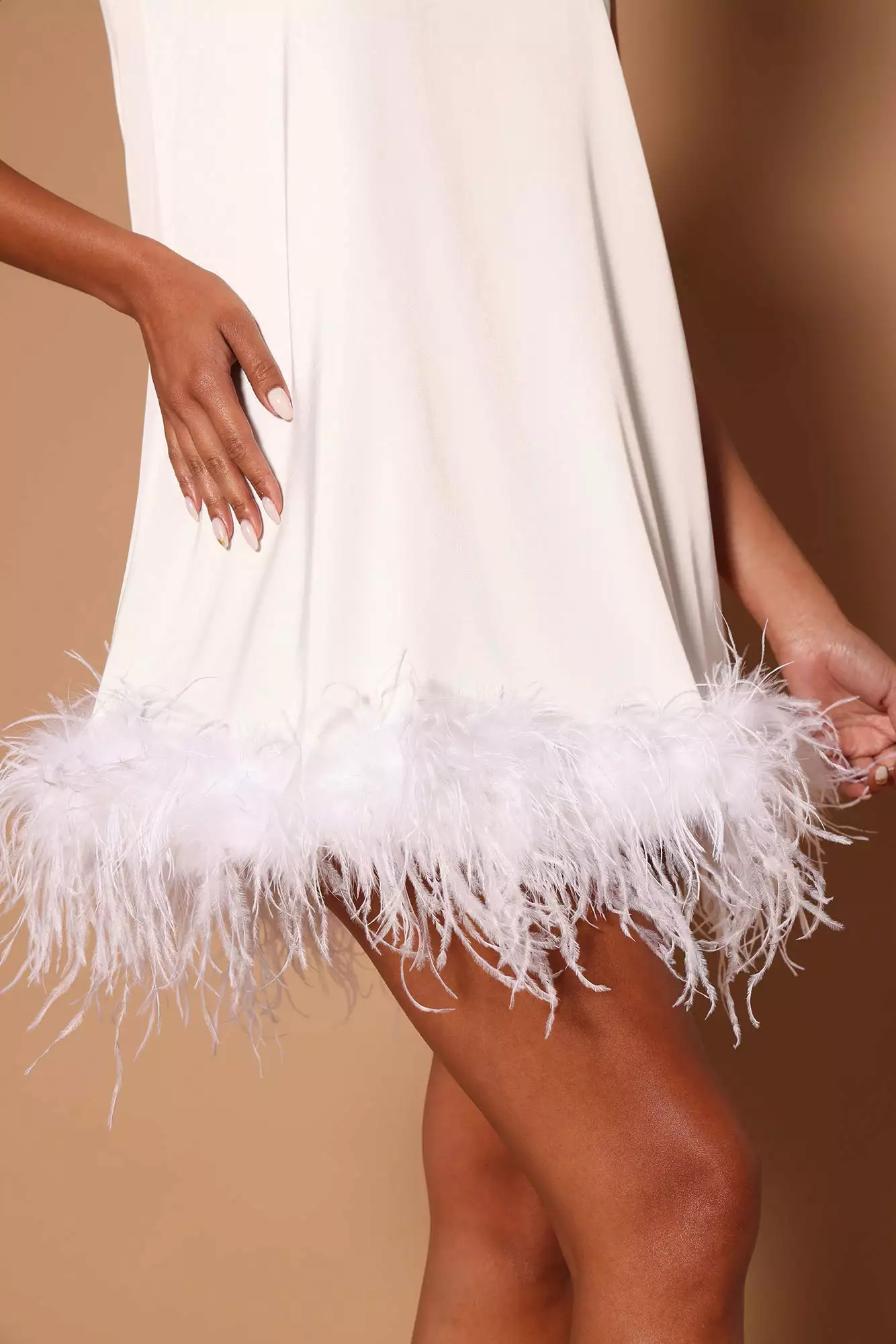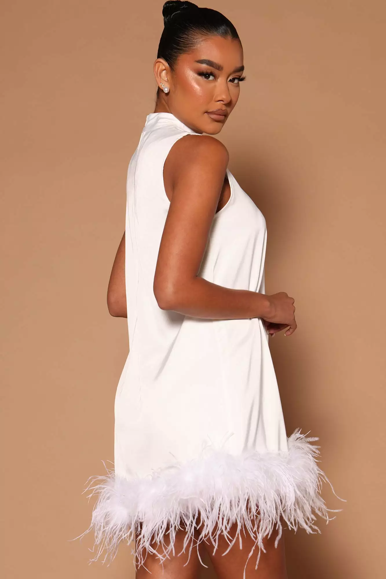 Fashion Nova Delia Feather Trim Mini Dress – White