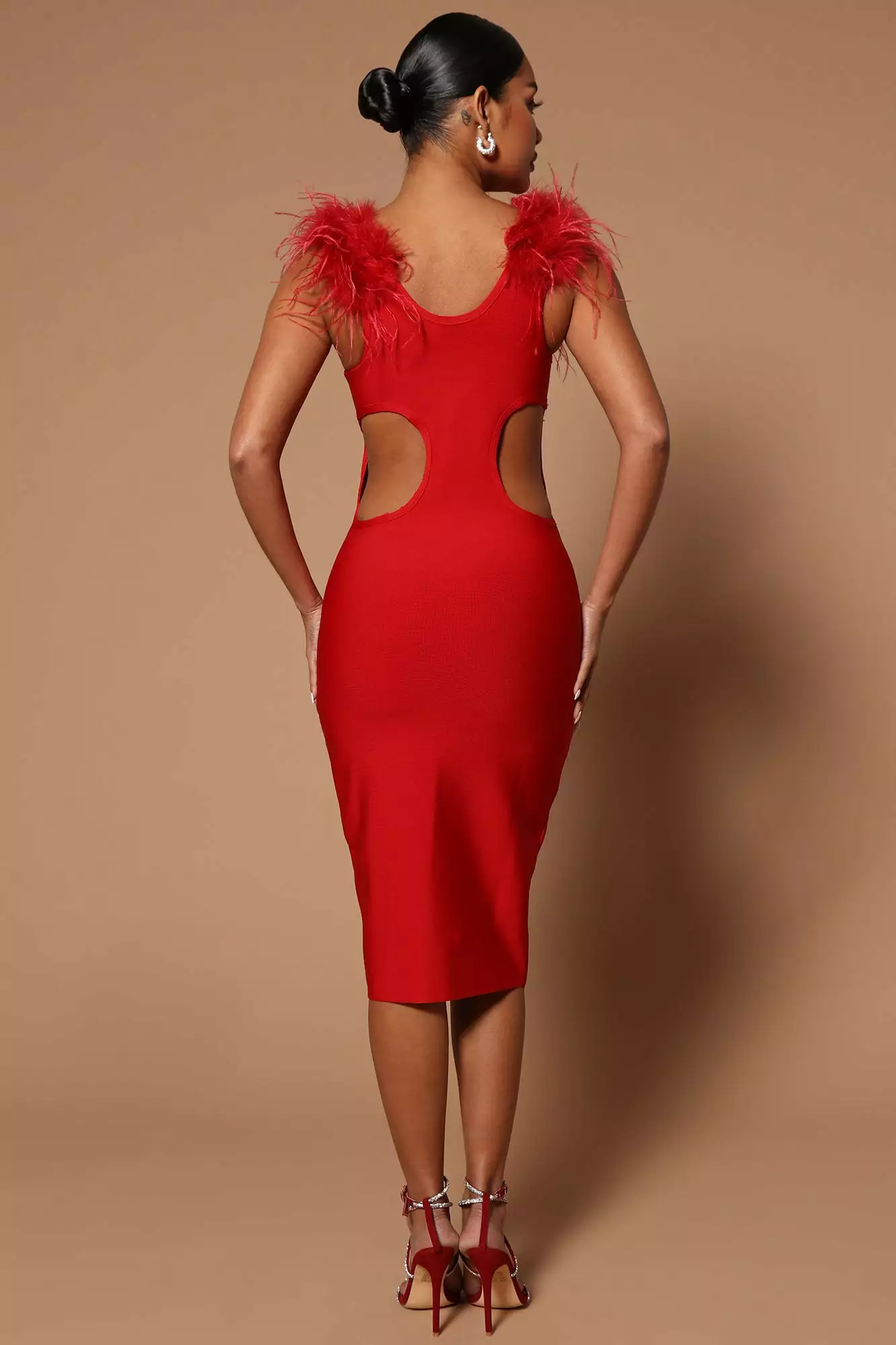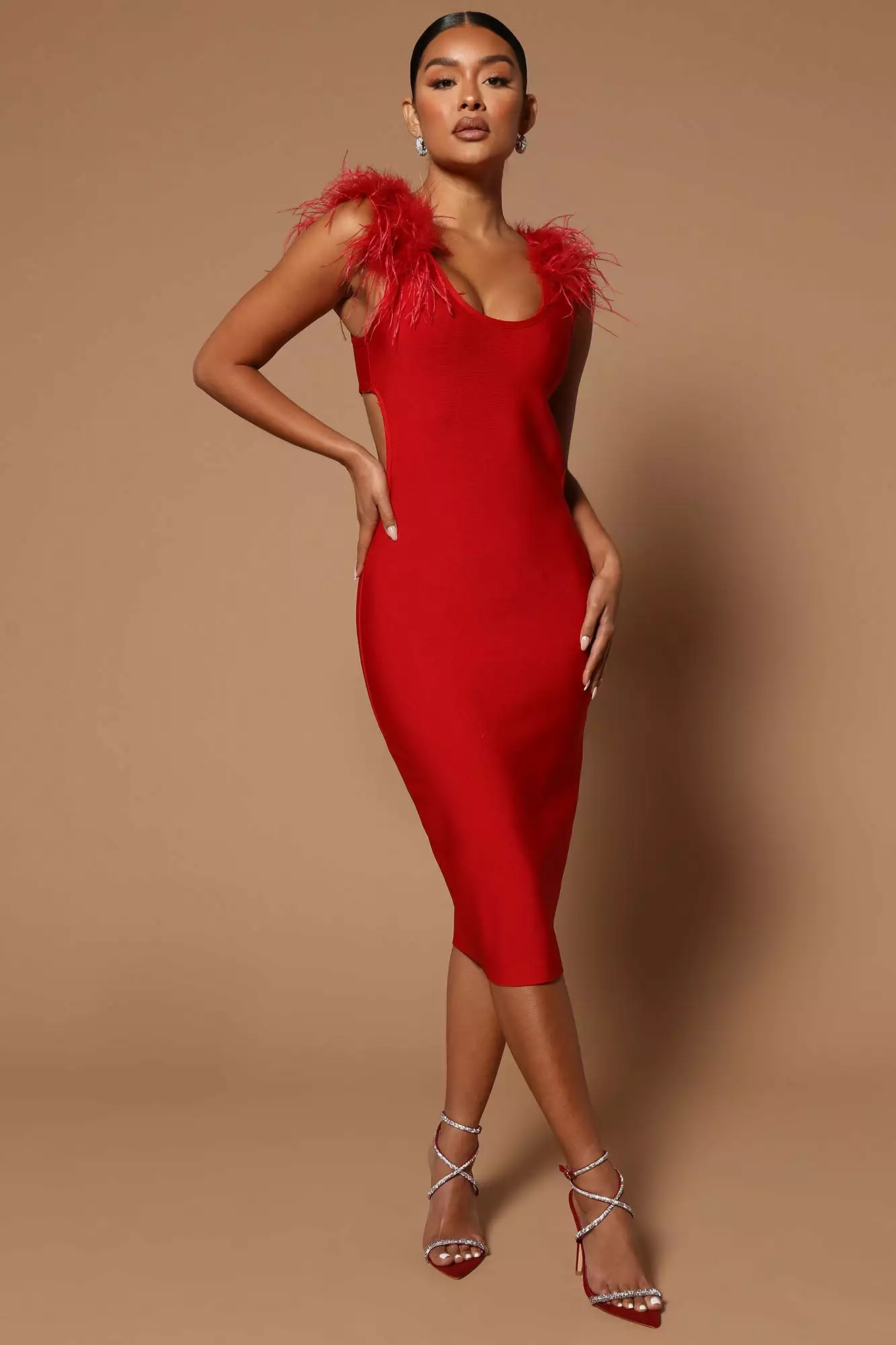 Fashion Nova Elisabeth Feather Midi Dress – Red