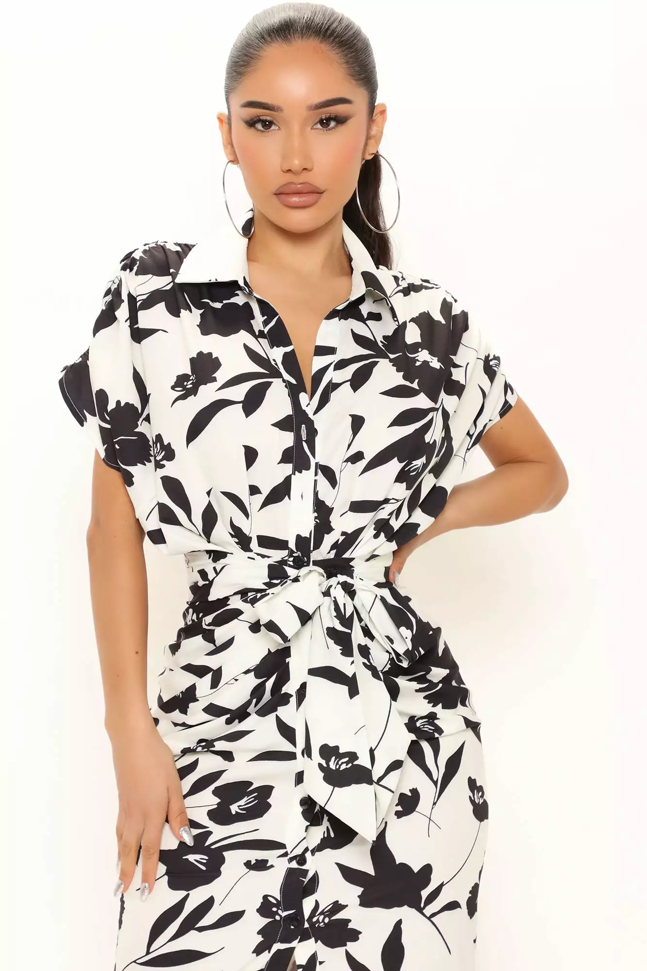 Fashion Nova Floral Emotions Shirt Dress – White/Black