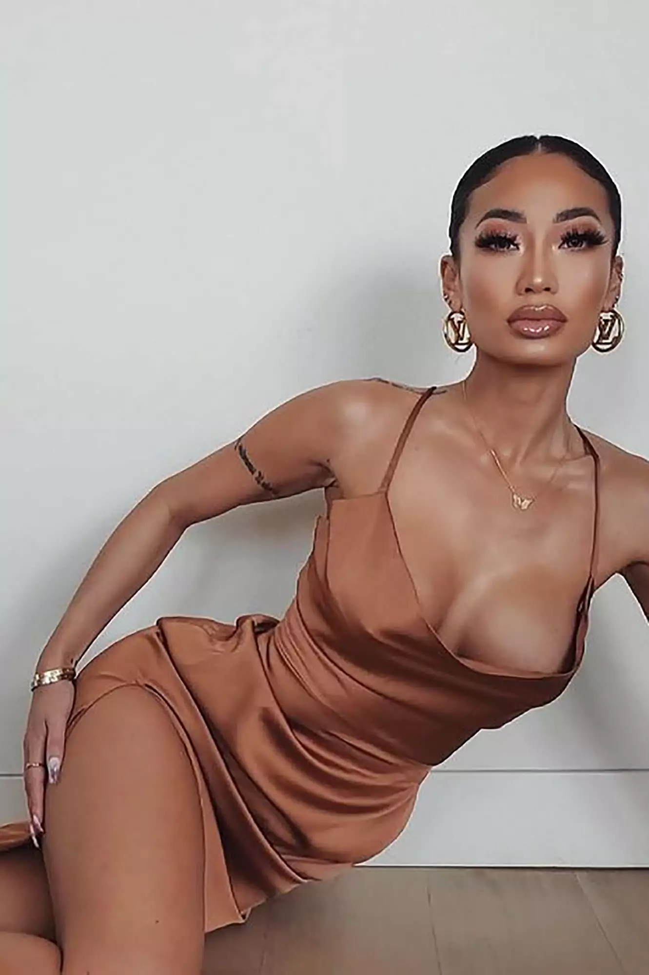 SKU: 1322566451324 Category: Midi Dresses Tags: All Promo, Back in Stock, Club, color:Bronze, ColorFam-Brown, detail:High Slit, Dresses, fabric:Satin, fallbogo