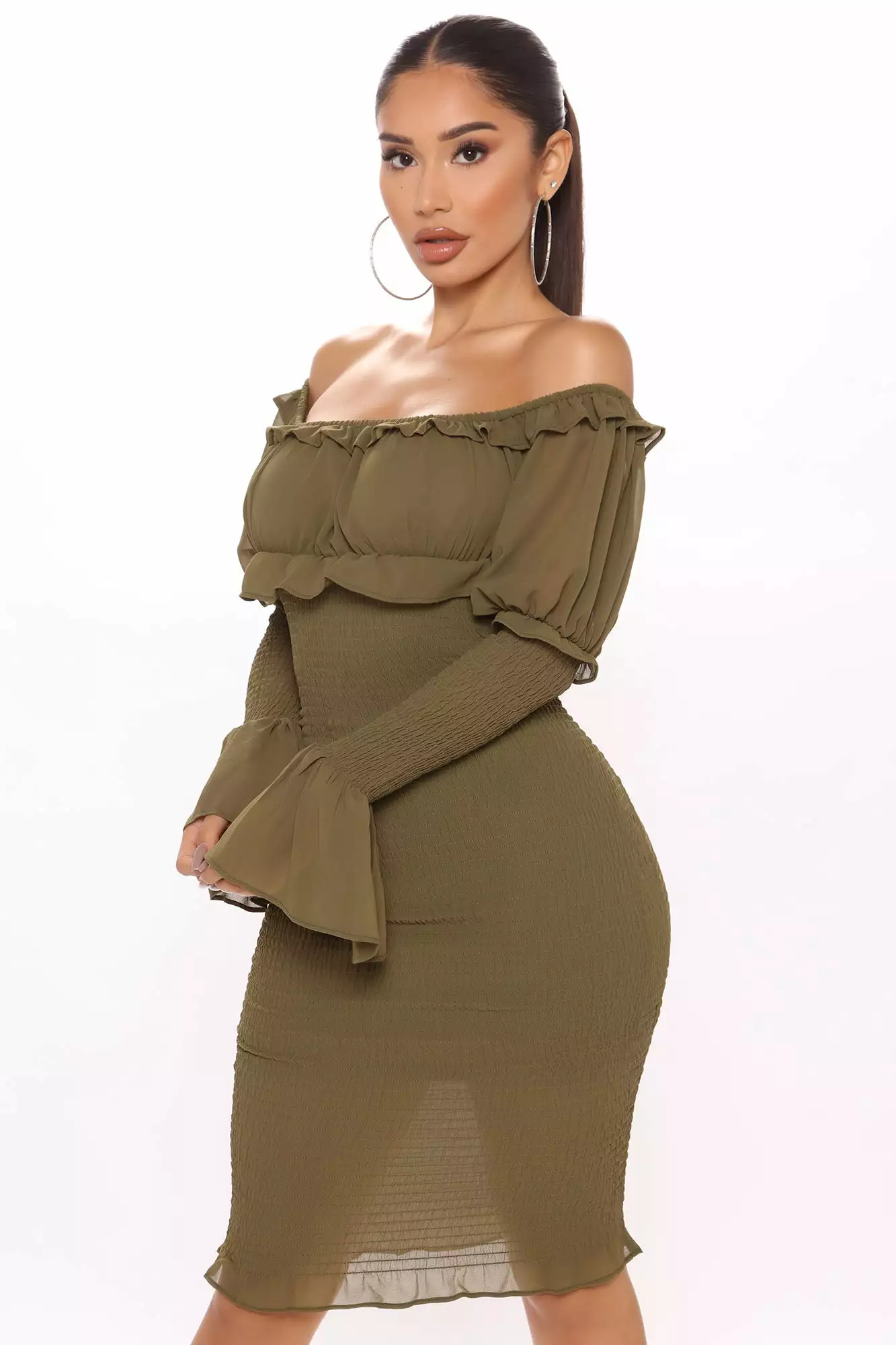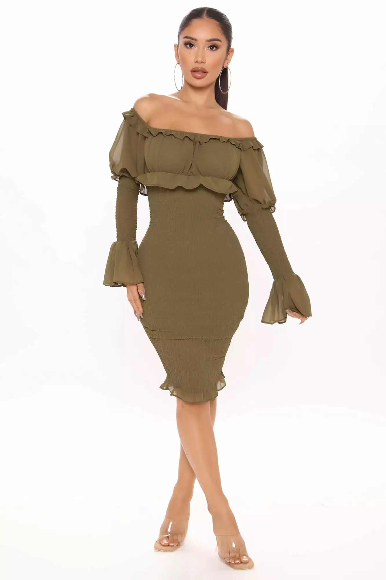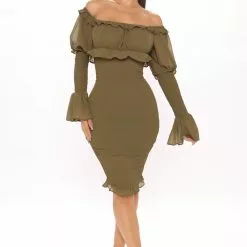 Fashion Nova Kiss Me Smocked Midi Dress – Olive