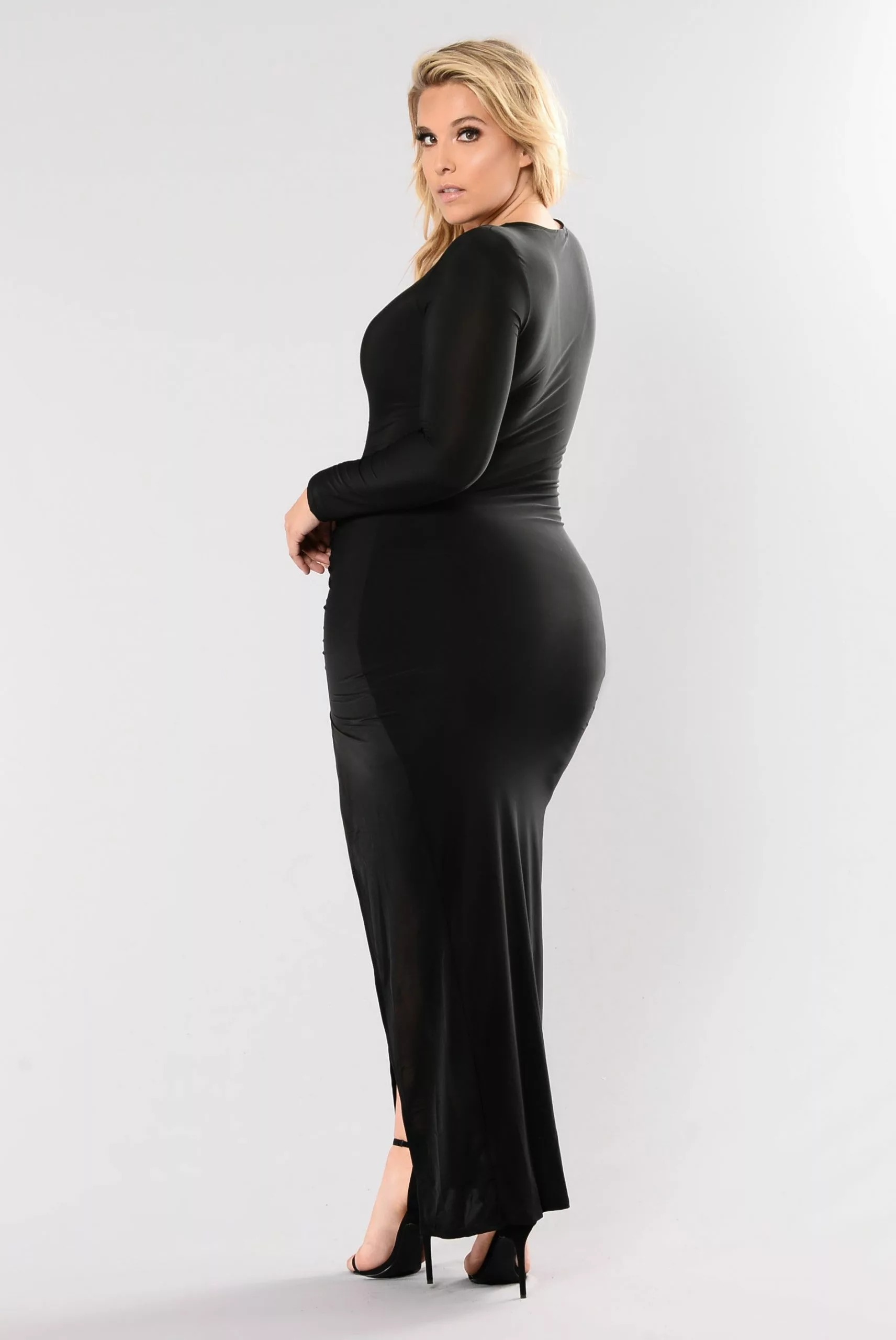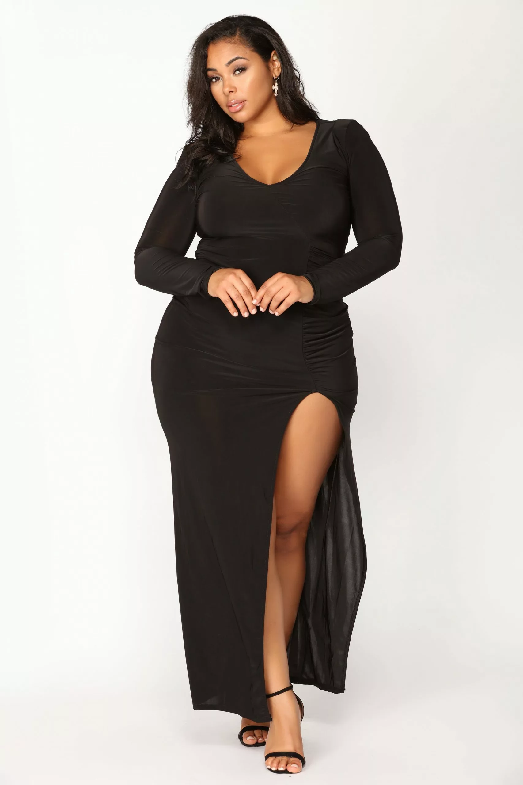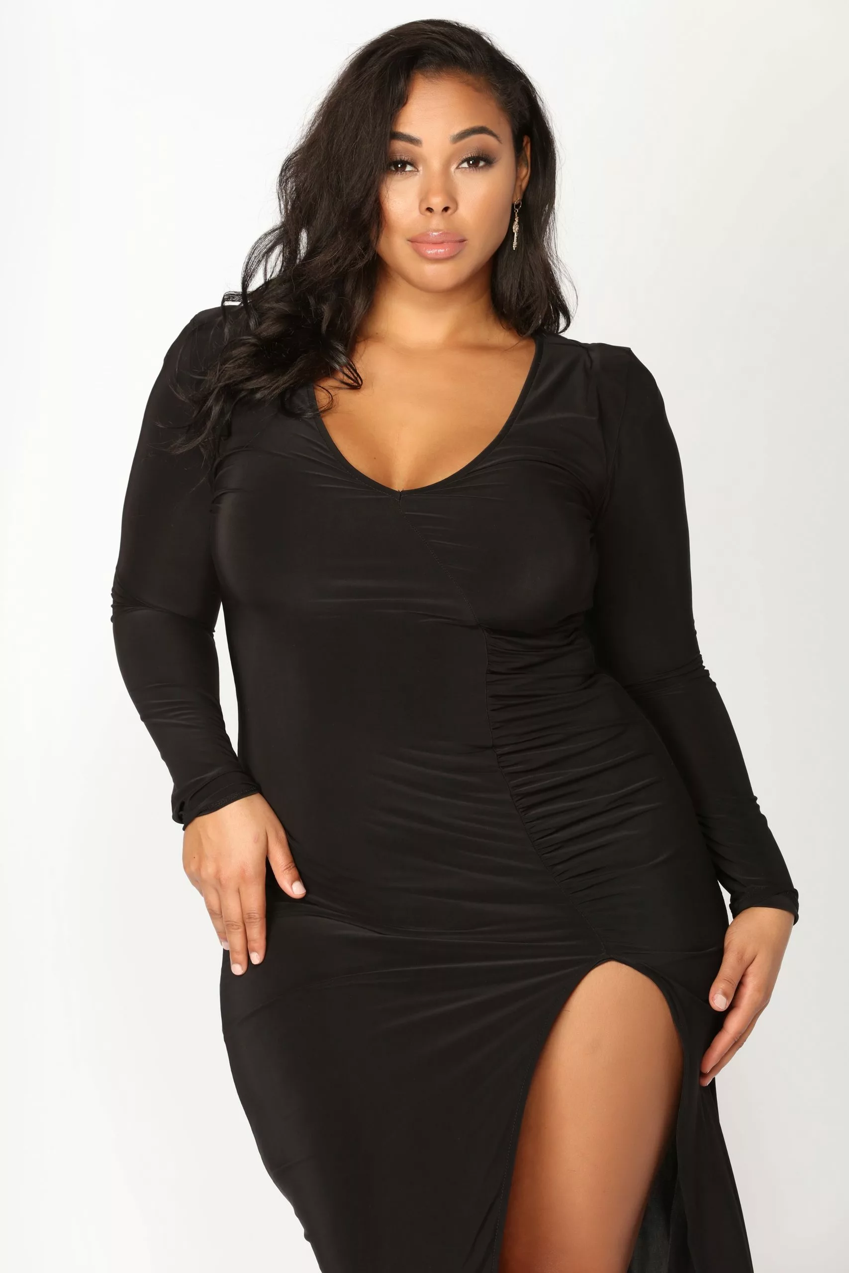 A magician never reveals her secrets. Our Love Sex Magic Dress in Black features a ruching detail that will hide what you hate while it flaunts what you love, a deep V neckline, light shoulder pads and a thigh-high front slit that won’t quit.