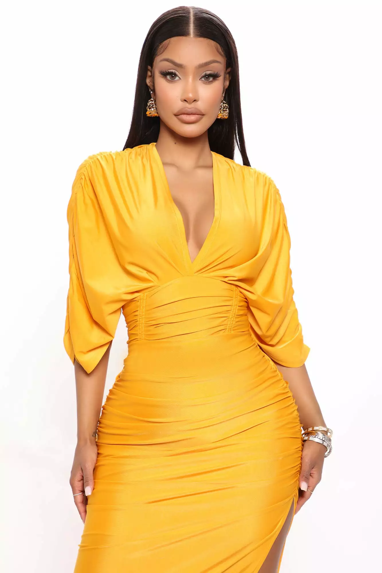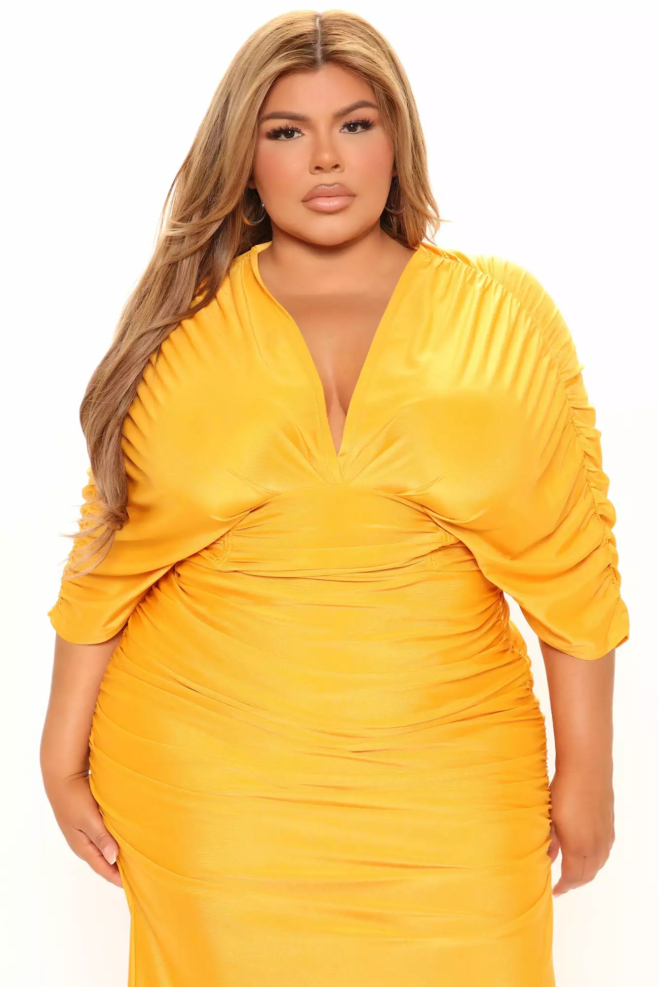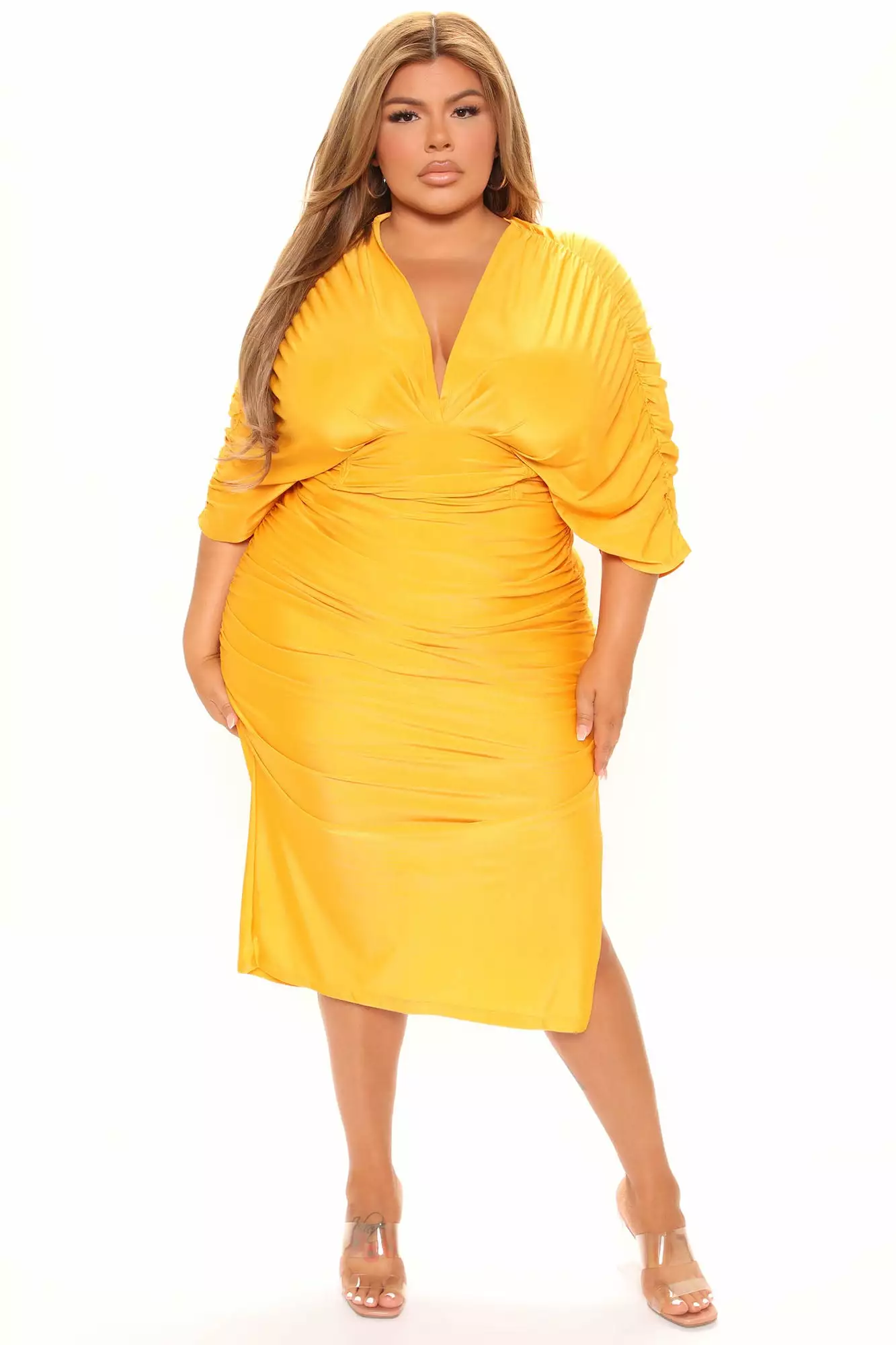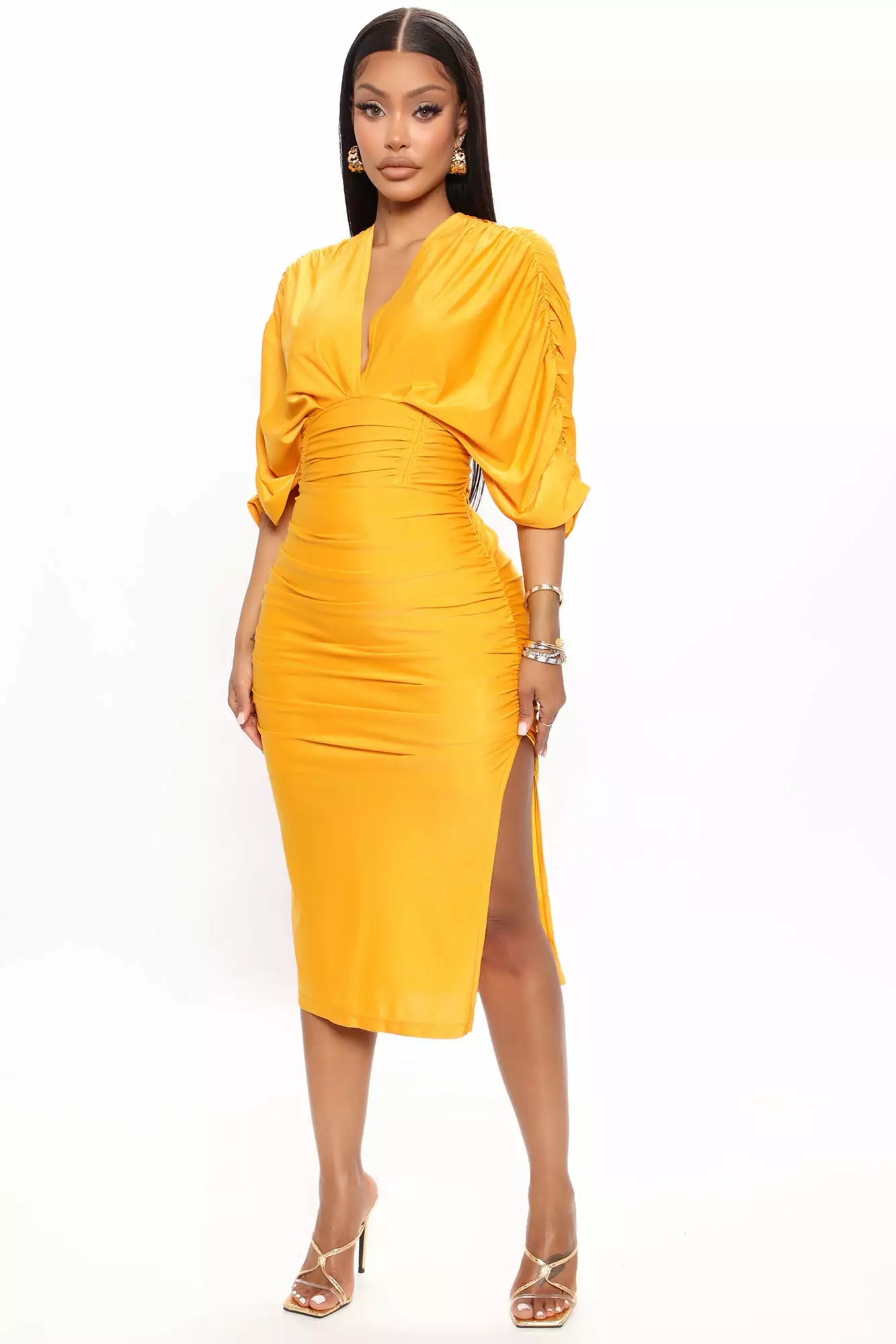 Fashion Nova Mandy Ruched Midi Dress – Mustard