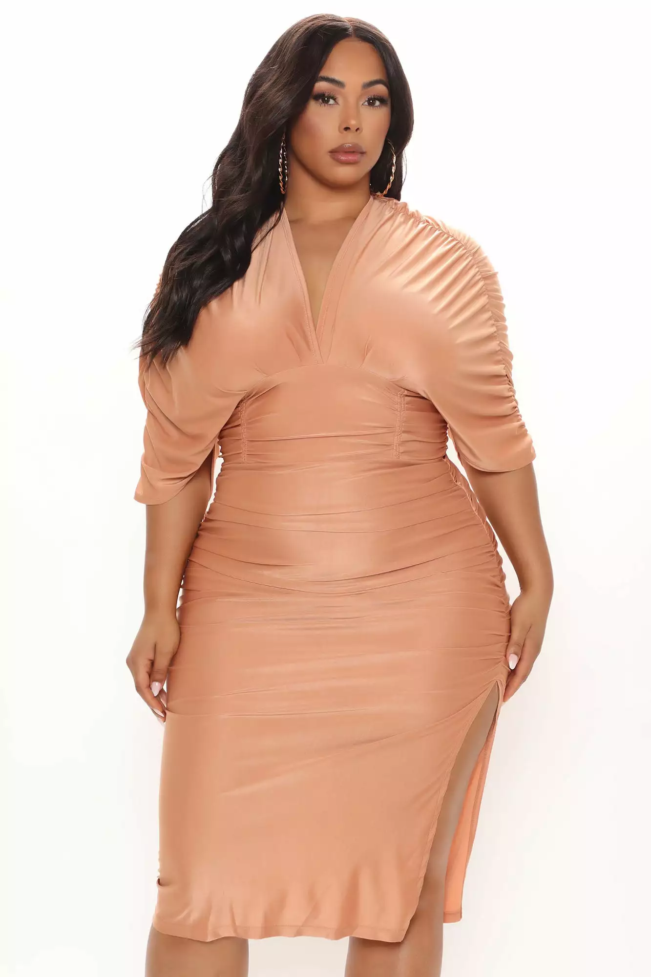 Fashion Nova Mandy Ruched Midi Dress – Peach