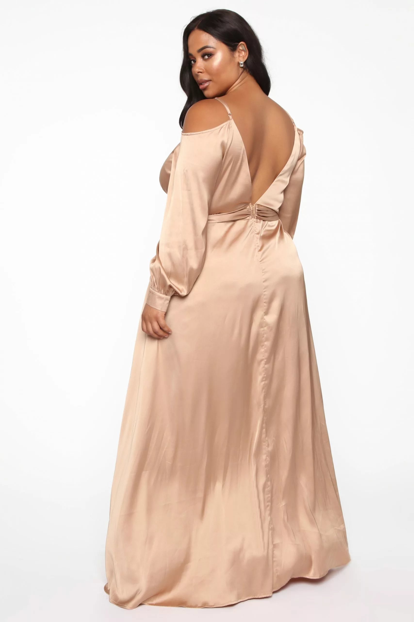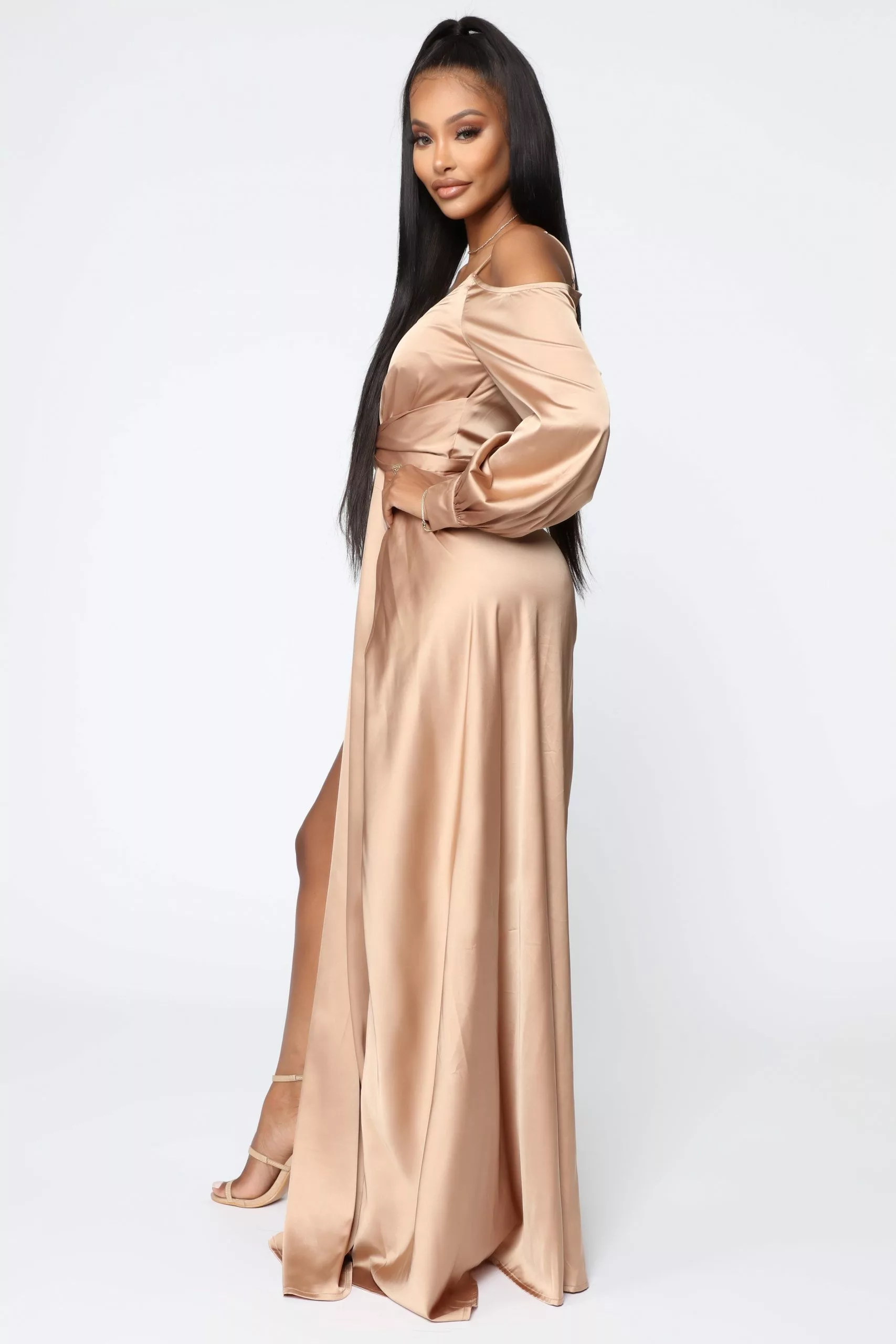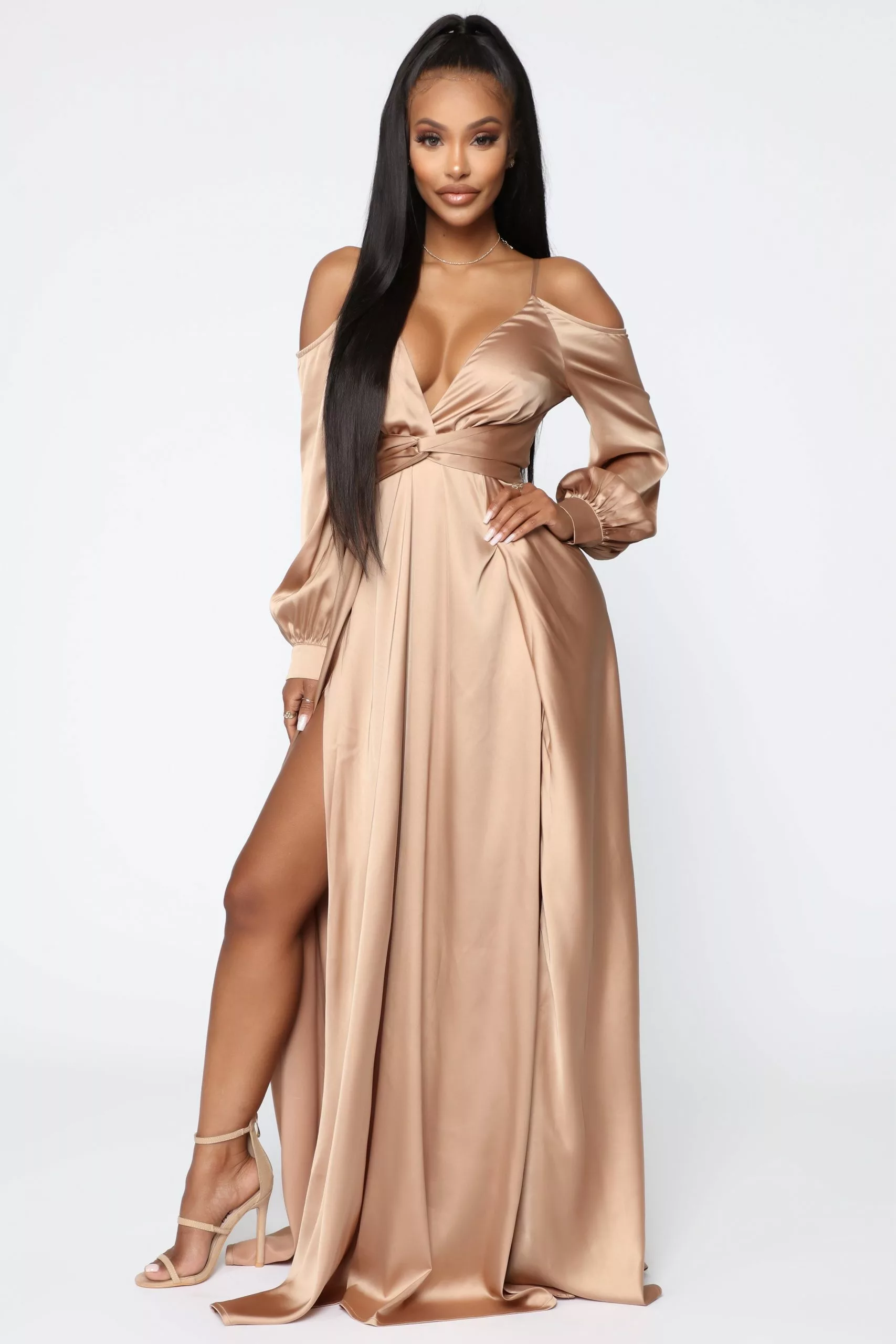 Fashion Nova Mansion Dinner Party Satin Gown – Gold/Brown
