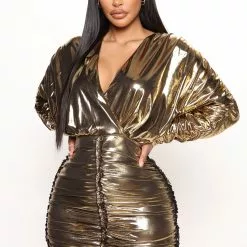Fashion Nova Metallic Vision Mini Dress – Gold