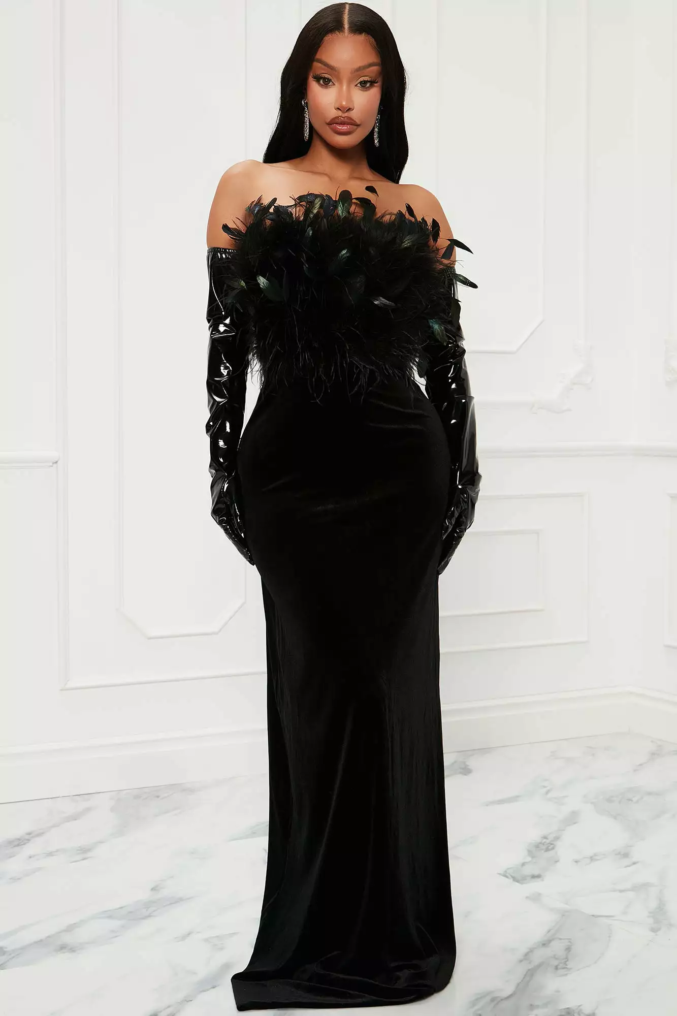 SKU: 6537358114940 Category: Maxi Dresses Tags: All Promo, atticket, color:Black, ColorFam-Black, Dresses, fabric:Velvet, fallbogo, feather, LBD