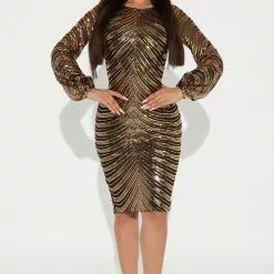 Fashion Nova Moonlight Sequin Midi Dress – Gold