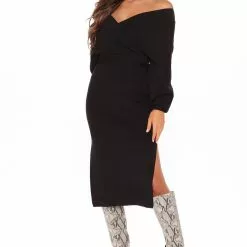 Fashion Nova Wrapped All Around Me Midi Sweater Dress – Black