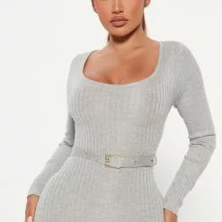 Fashion Nova Loop Me In Belted Sweater Dress – Heather Grey