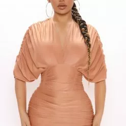 Fashion Nova Mandy Ruched Midi Dress – Peach