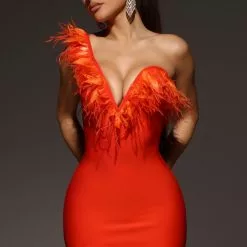 Fashion Nova Alana One Shoulder Feather Midi Dress – Orange