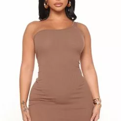 Fashion Nova CeCe One Shoulder Mini Dress – Brown