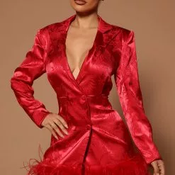 Fashion Nova Brianna Feathered Blazer Dress – Red