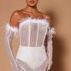 Fashion Nova Cheri Sequin Mesh Feather Trim Maxi Dress – White