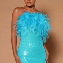 Fashion Nova Brandi Sequin Feather Mini Tube Dress – Turquoise