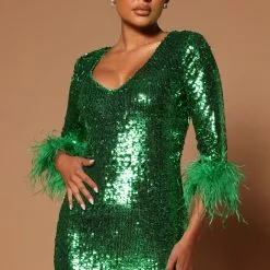 Fashion Nova Brooke Sequin Feather Trim Mini Dress – Green