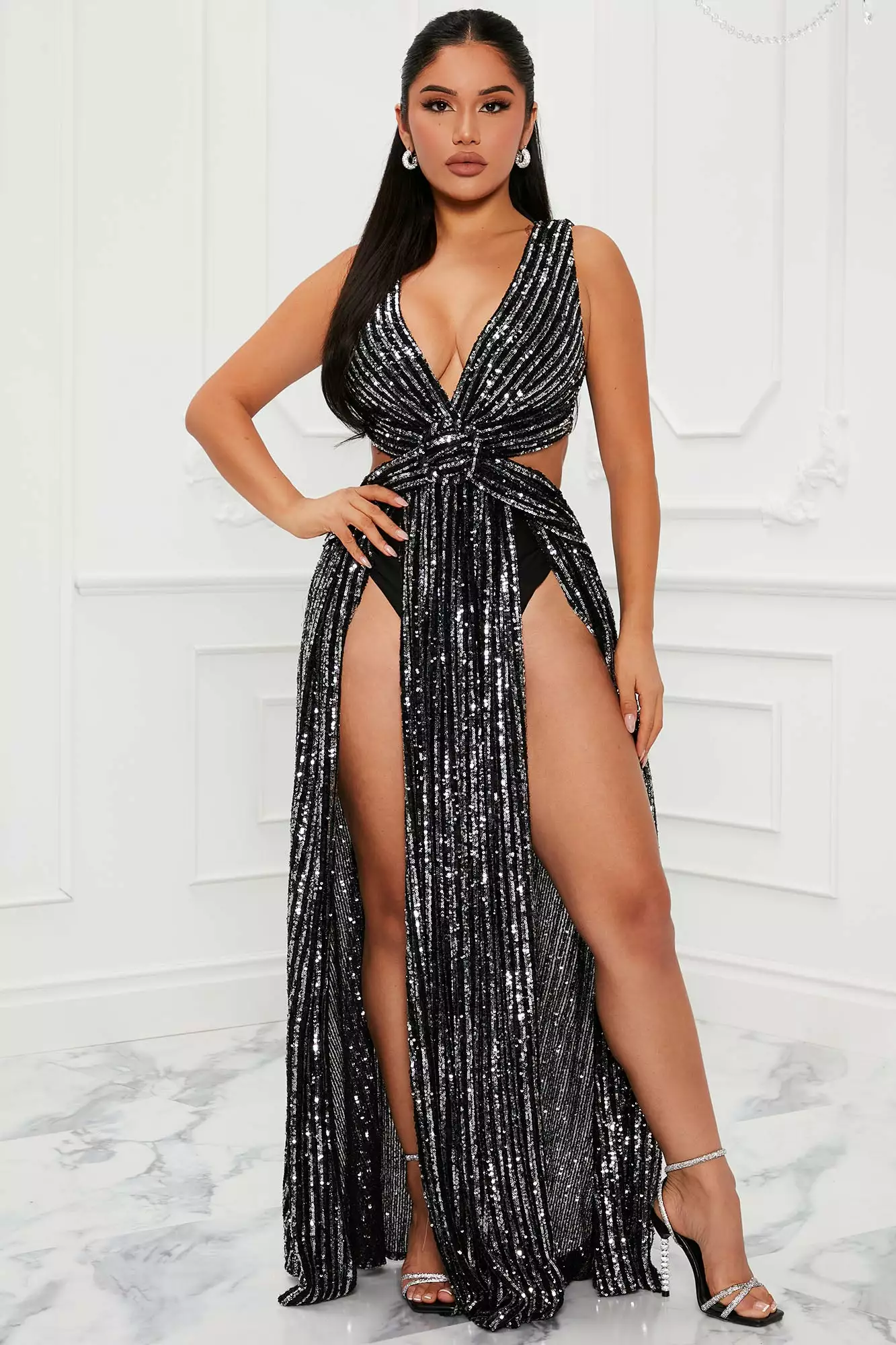 Fashion Nova Reignite The Flame Sequin Maxi Dress – Black/Silver
