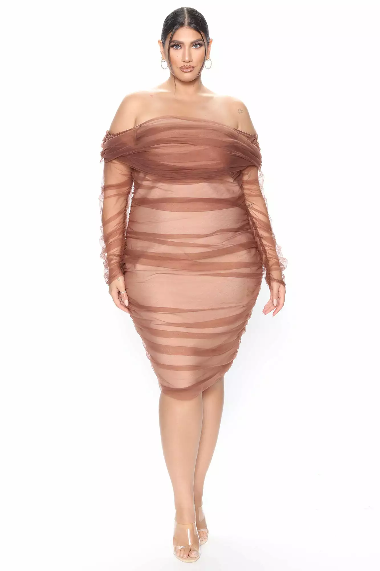 Fashion Nova Ruched And Ready Bandage Midi Dress – Taupe