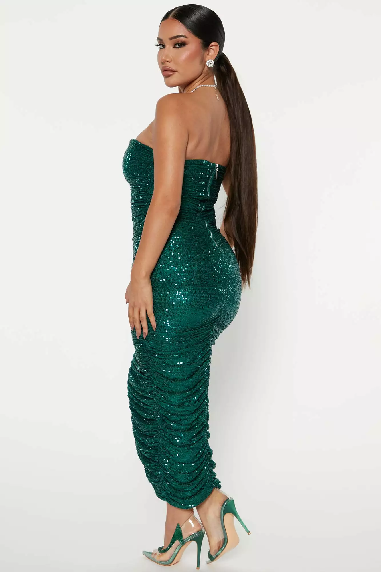 Fashion Nova Ruched Everywhere Sequin Midi Dress – Hunter