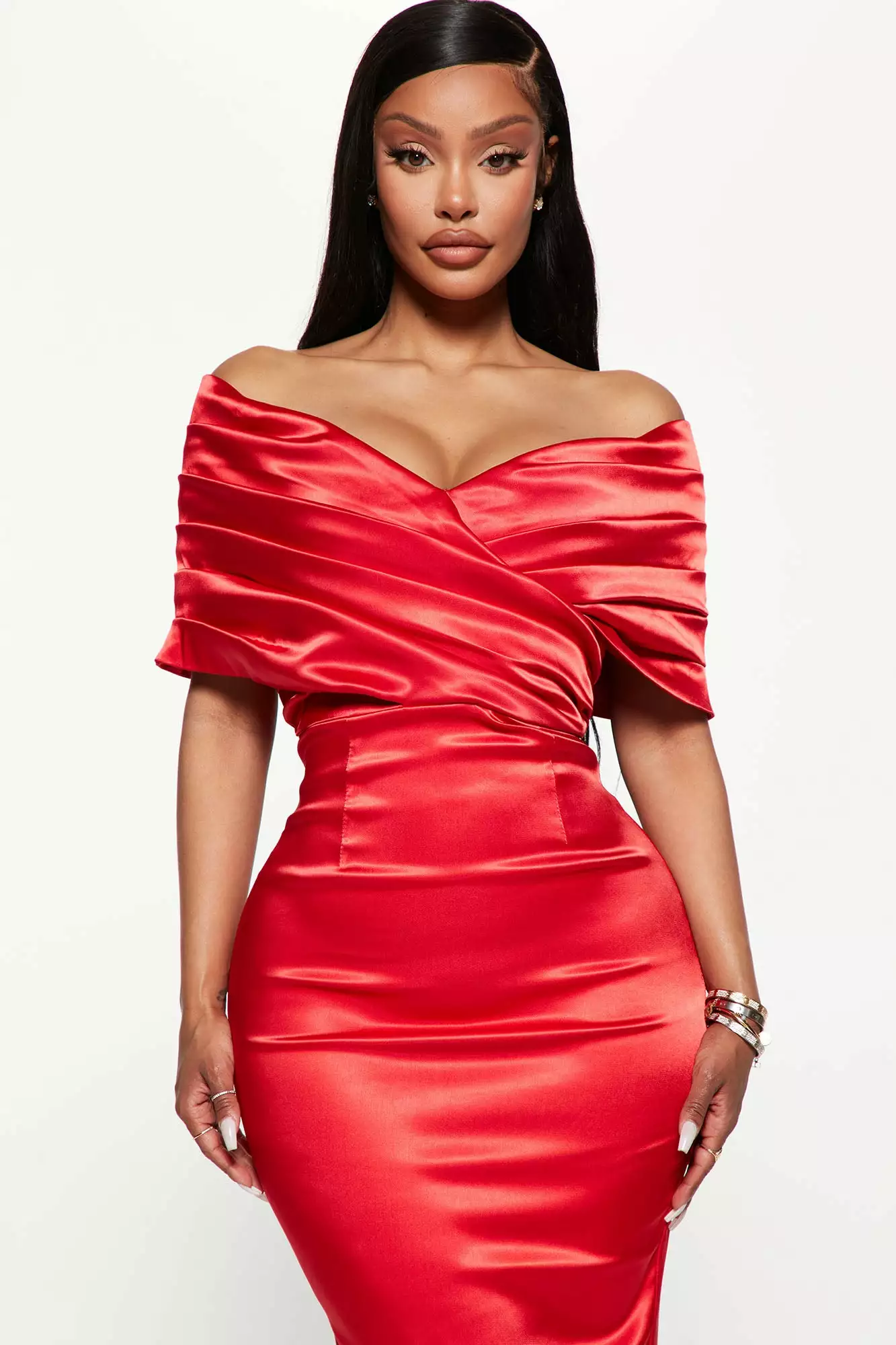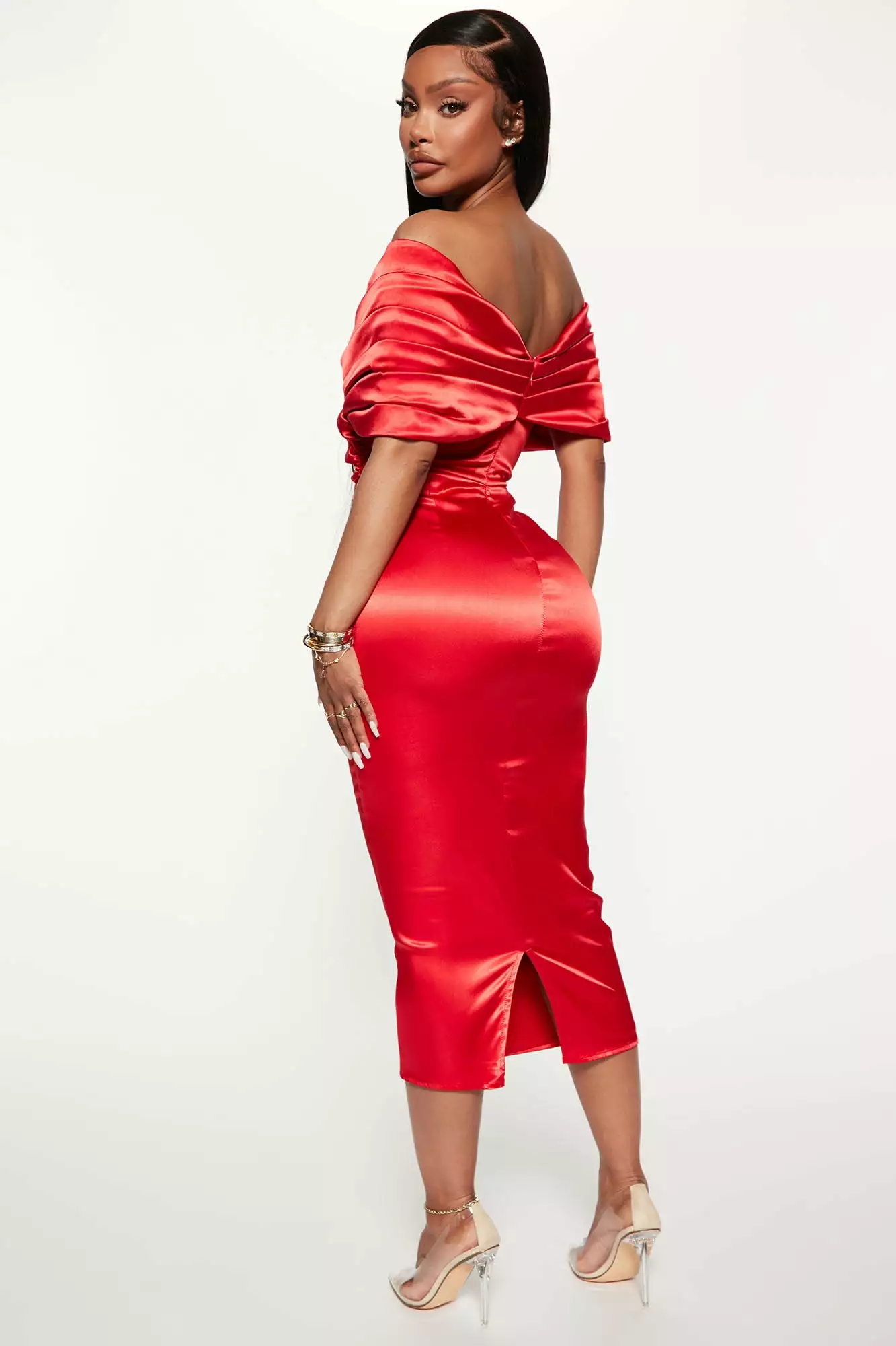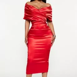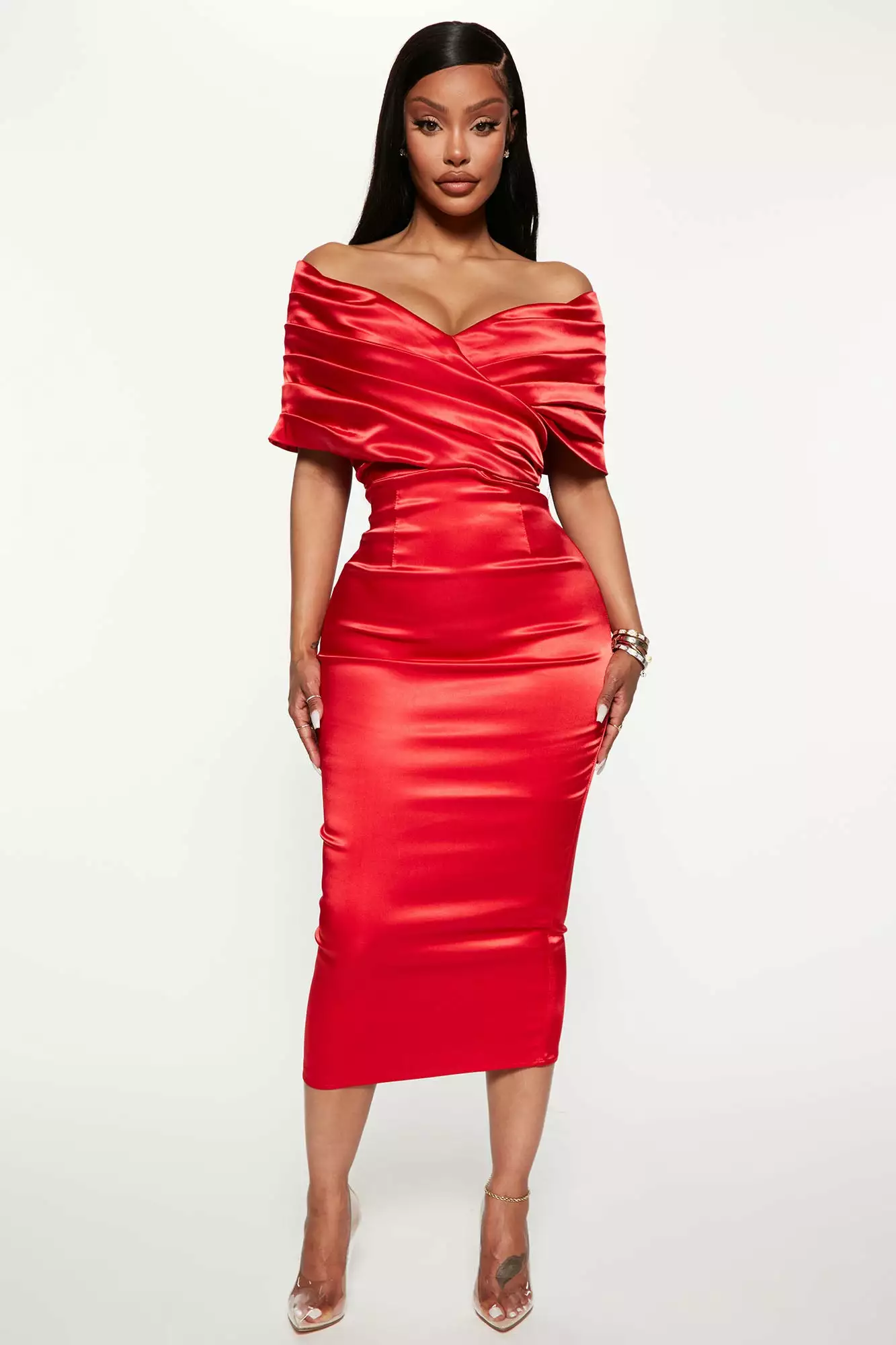 Fashion Nova She’s Elegant Satin Midi Dress – Red