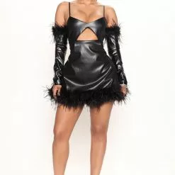 Fashion Nova Alexis Feather Belted Mini Dress – Black/Blue