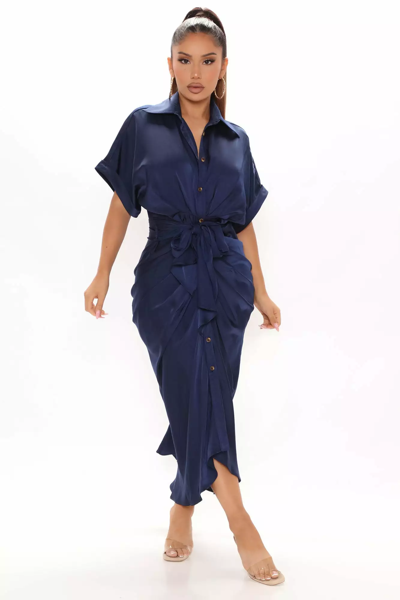 Fashion Nova Stuck In The City Satin Midi Dress – Navy