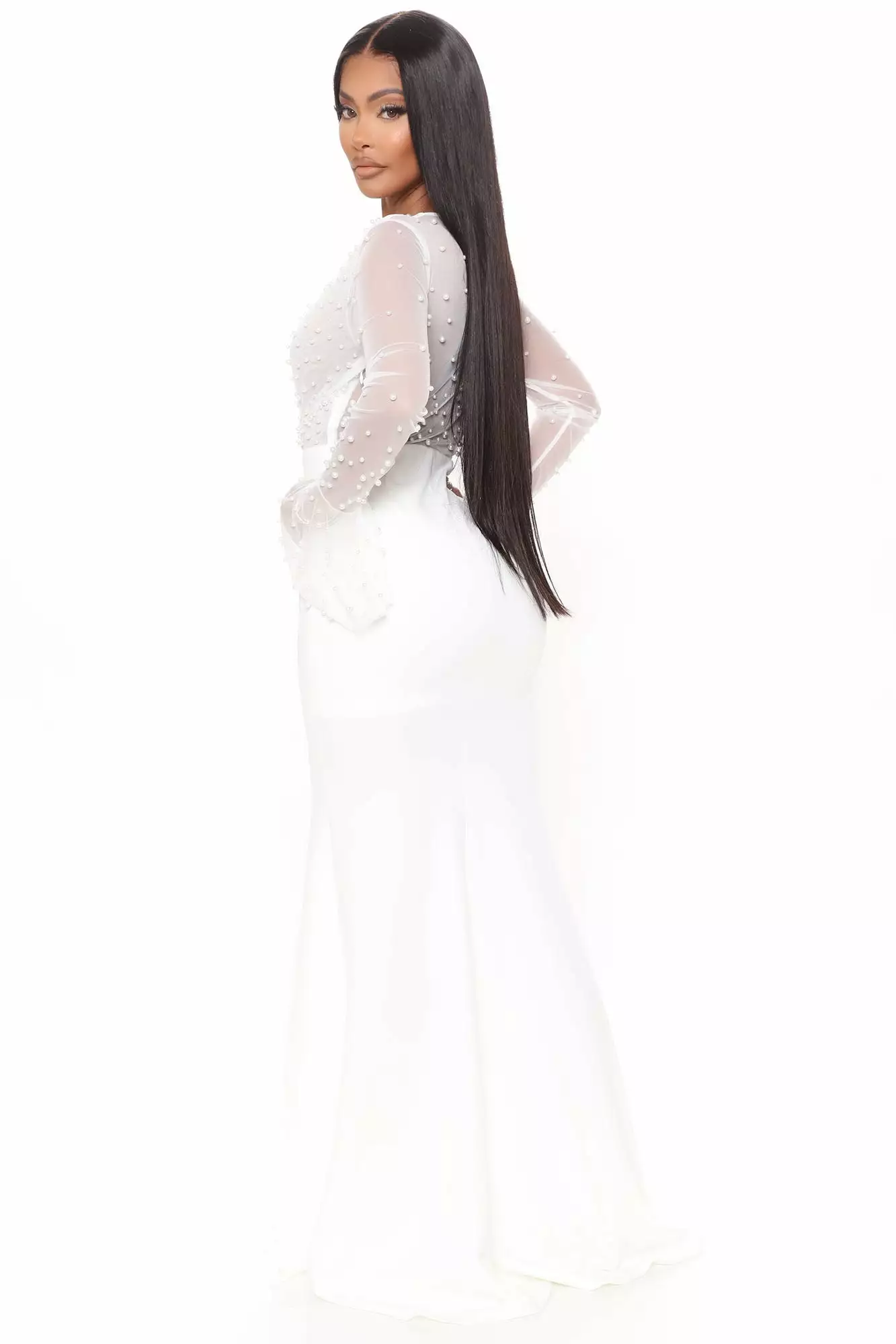 Fashion Nova Whitney Pearl Embellished Gown – White