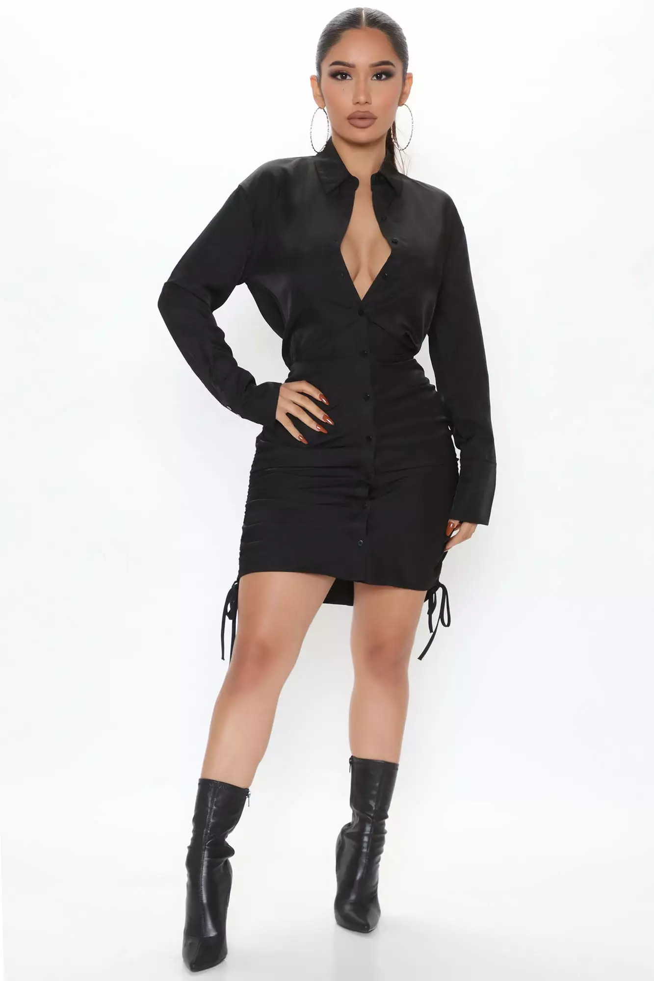 Fashion Nova Wisdom Ruched Shirt Dress – Black