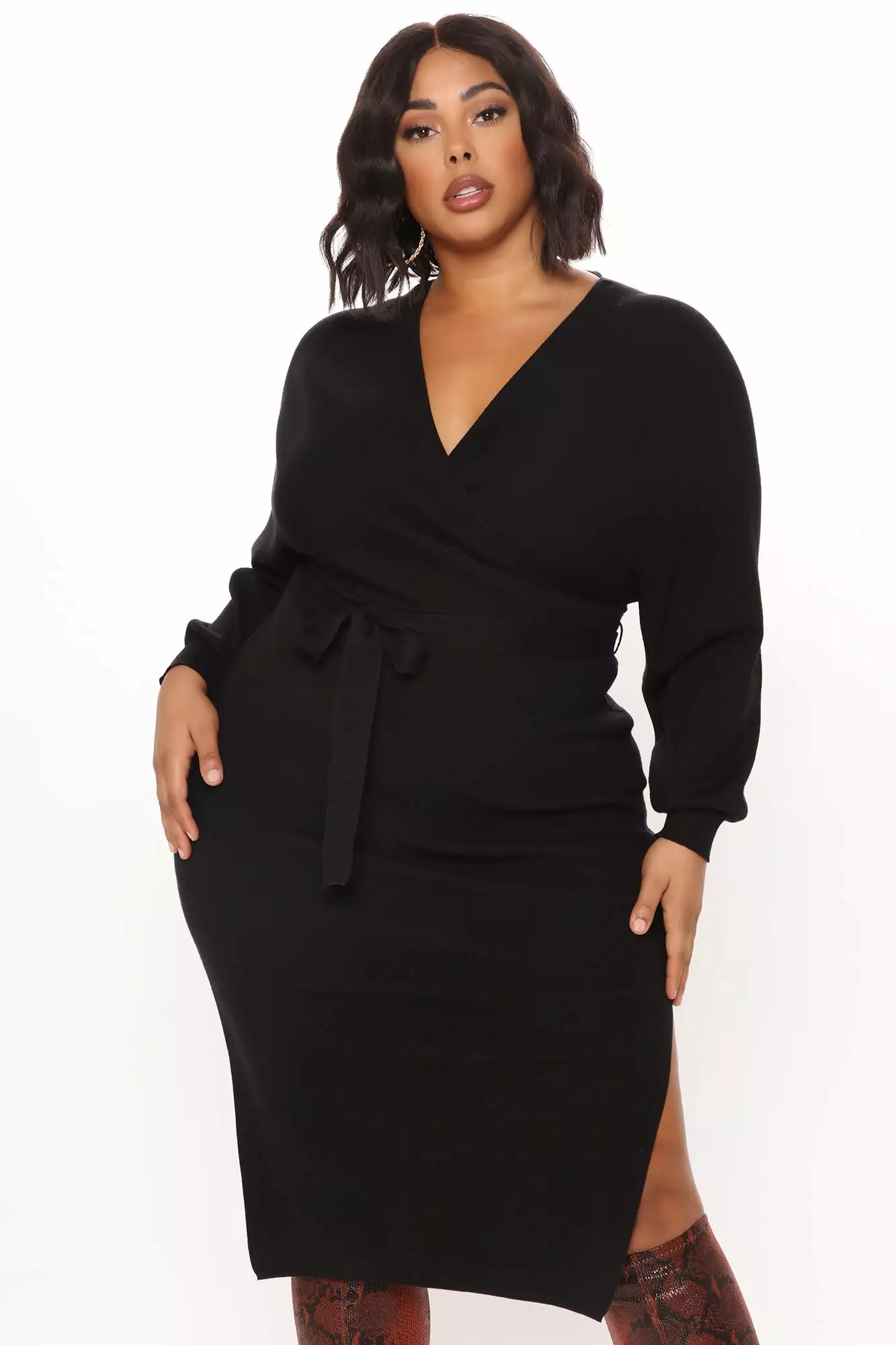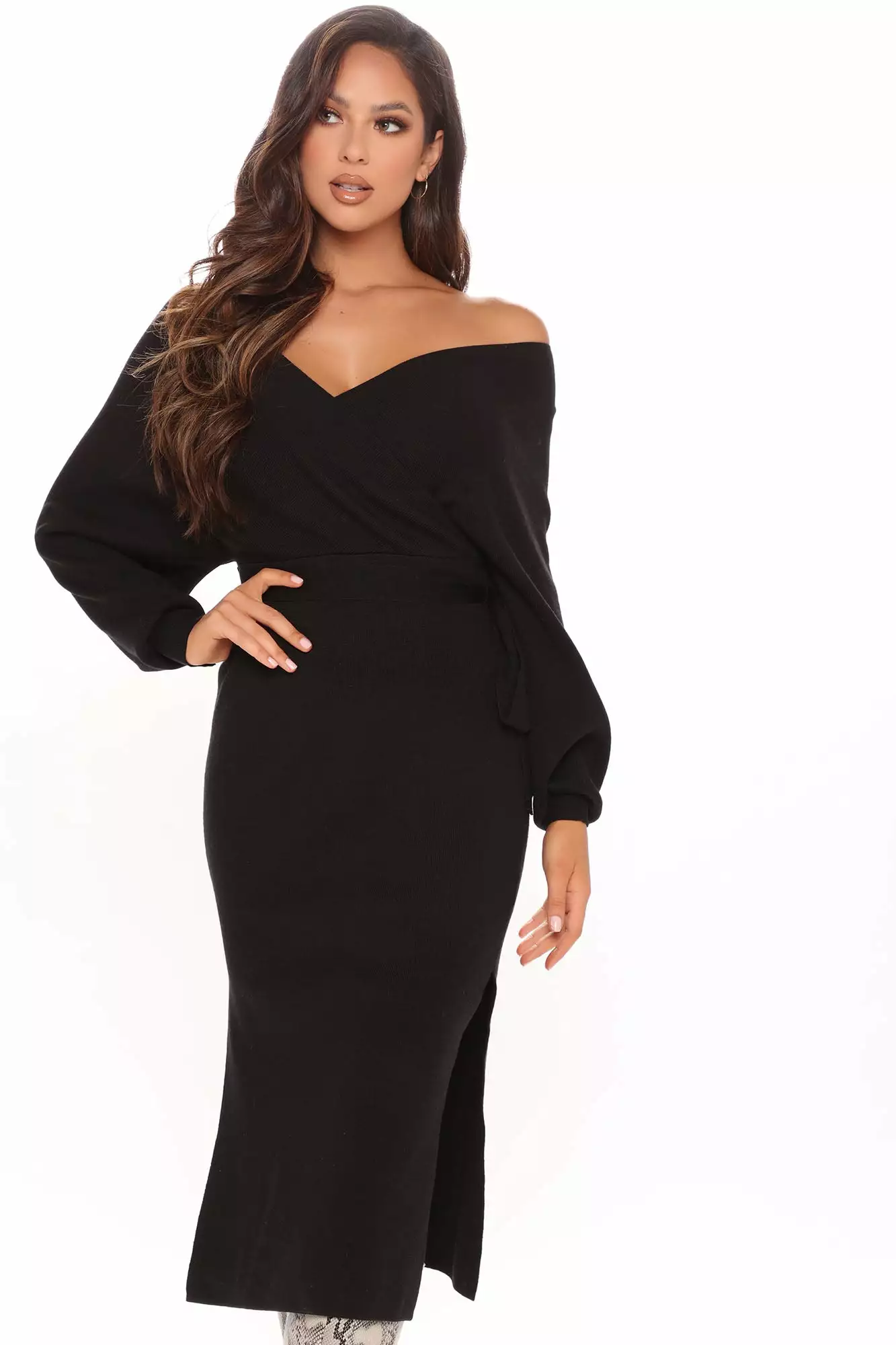 Fashion Nova Wrapped All Around Me Midi Sweater Dress – Black