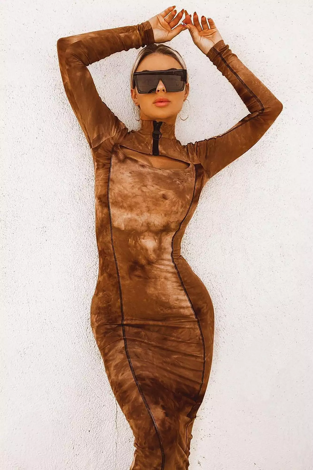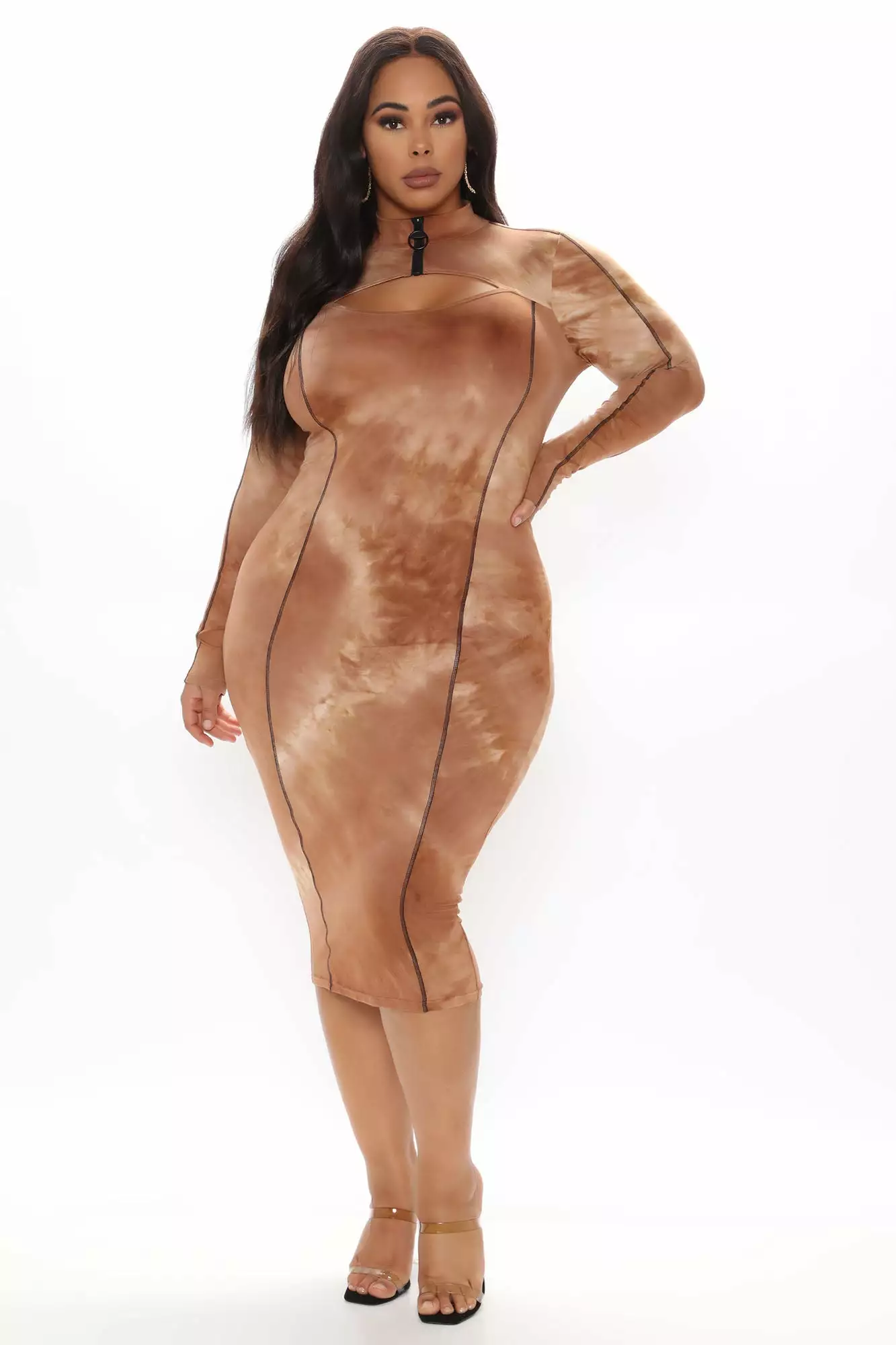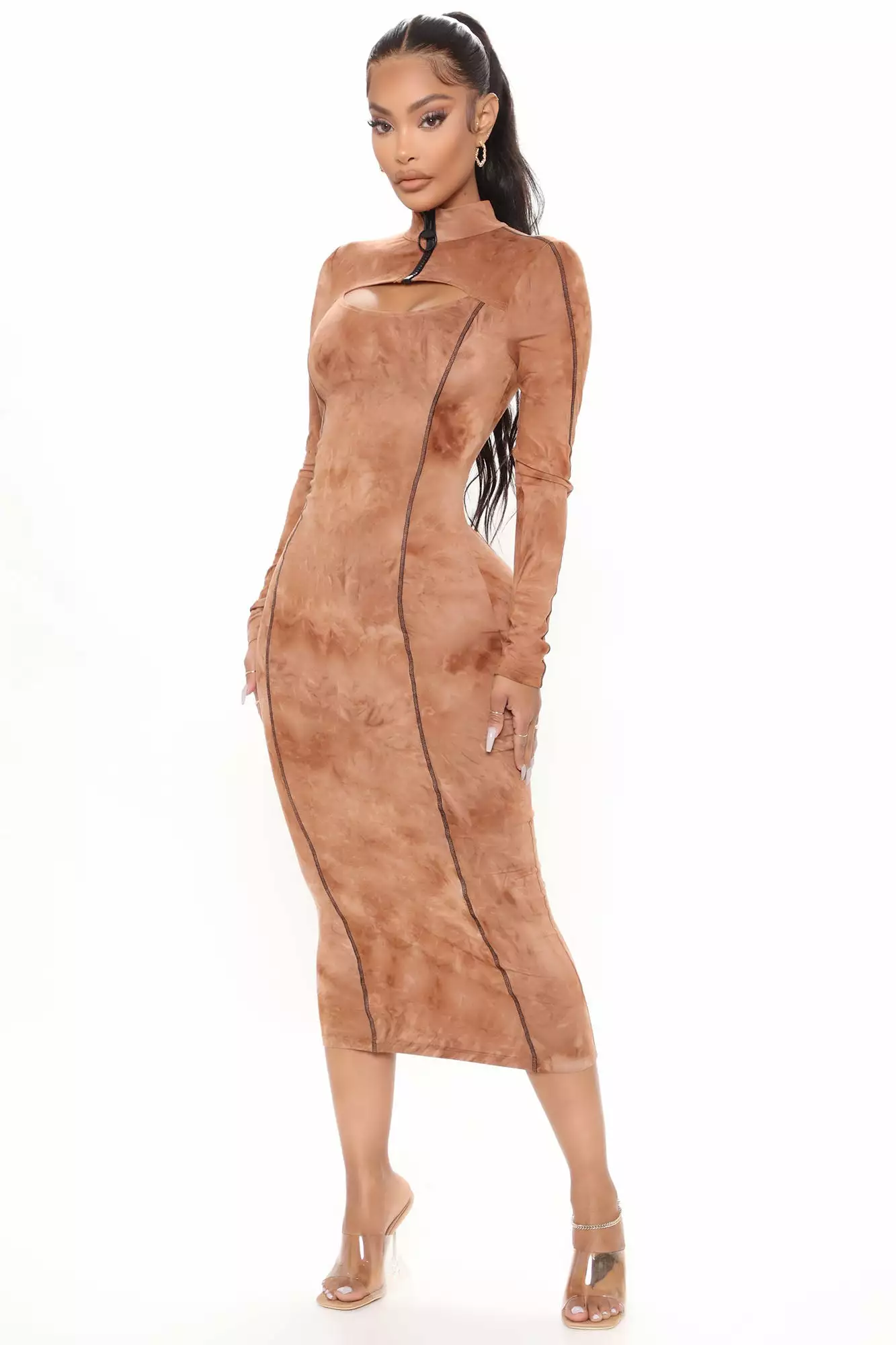 Fashion Nova Zipped In Tie Dye Midi Dress – Brown